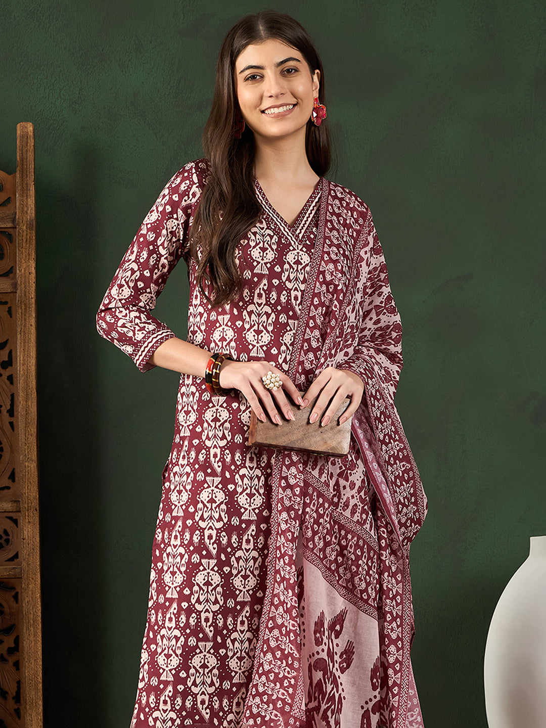 Zeresouq Women Maroon Rayon Blend Ethnic Motifs Printed Straight Kurta Trouser With Dupatta By Wearing Our New Amazing Product You Look Very Graceful Or Pretty. Thank you For Choosing Our Brand Zeresouq Product To Wear. We Hope That You Feel too much Better After Purchase Our Product. This Calf Length Straight Top Hemline Three-Quarter Sleeves, Side Slits kurta Sets is Best Match for Office-Work Wear, Normal Occasions, Get Together, Regular, Daily Use, Evening Wear. Perfect For Party, Wedding, Festival, Traditional, Causal, Bridle, Function, Trip. Best Gift For Your Loved Ones. NOTE: Dupatta length 2.25 mtr and Width 1.0 mtr Front Length ( Inches ): 46