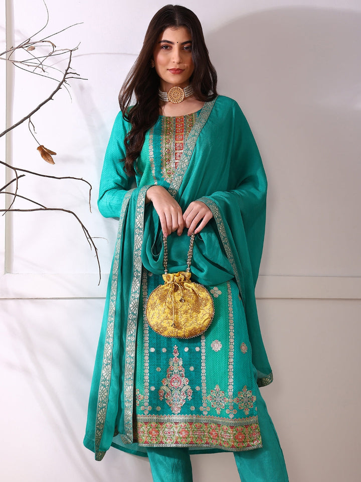 Zeresouq Exclusive Organza Fabric In This Attractive Teal Color Ready To Wear Kurta Set Will Make Sure That The Fitting Of This Beautiful Readymade Kurta Set Looks Elegant On You. Crafted With Shantoon Bottom Fabric, Woven Design Pattern With Calf Length Straight Top Shape With Round Neck Kurta It Is Light In Weight And Will Be Soft Against Your Skin. Three-Quarter Sleeves Kurta Its Unique Design And Beautiful Colour Will Fetch A Lot Of Second Glances As You Club It With Contrast Colored Pumps And Flashy Accessory. NOTE: Dupatta length 2.25 mtr and Width 1.0 mtr Front Length ( Inches ): 46