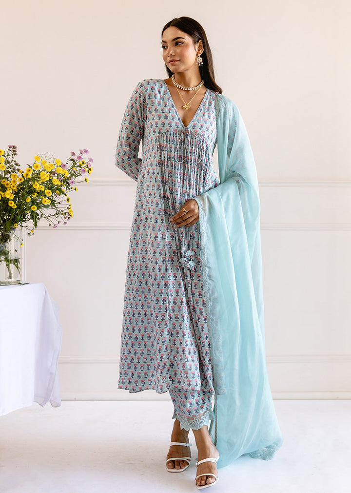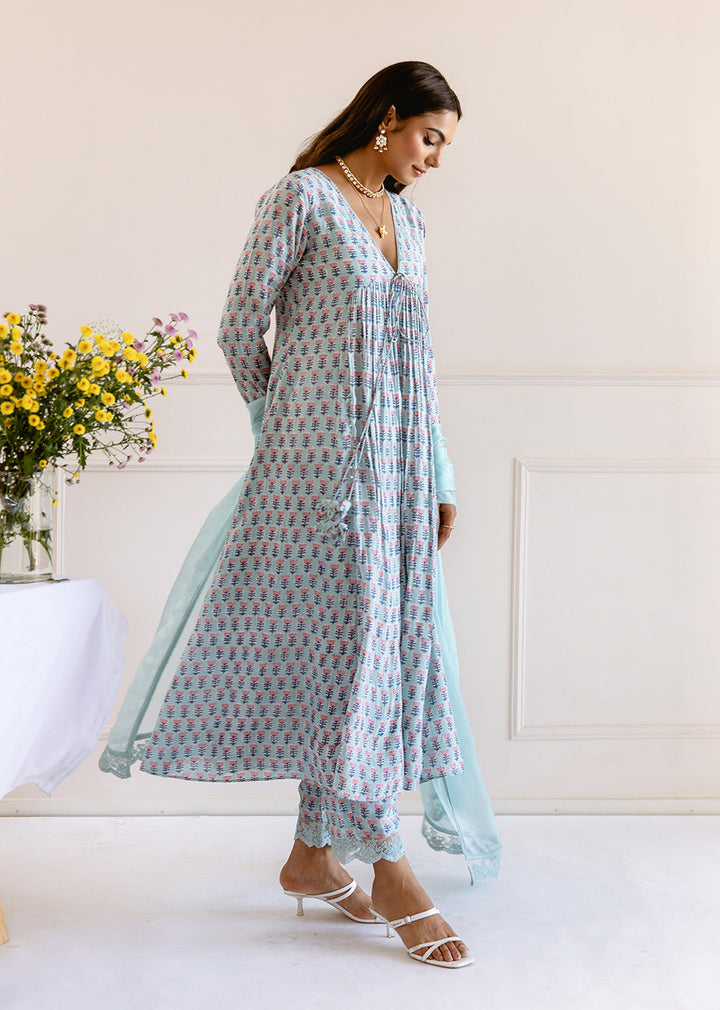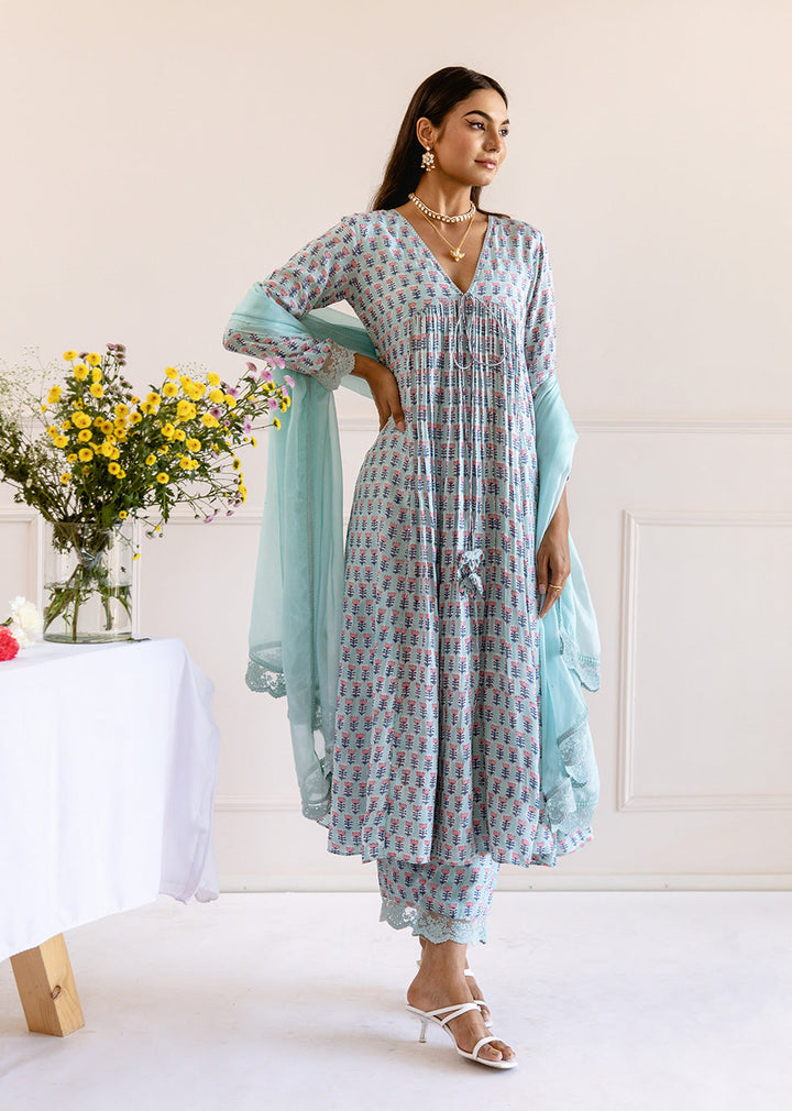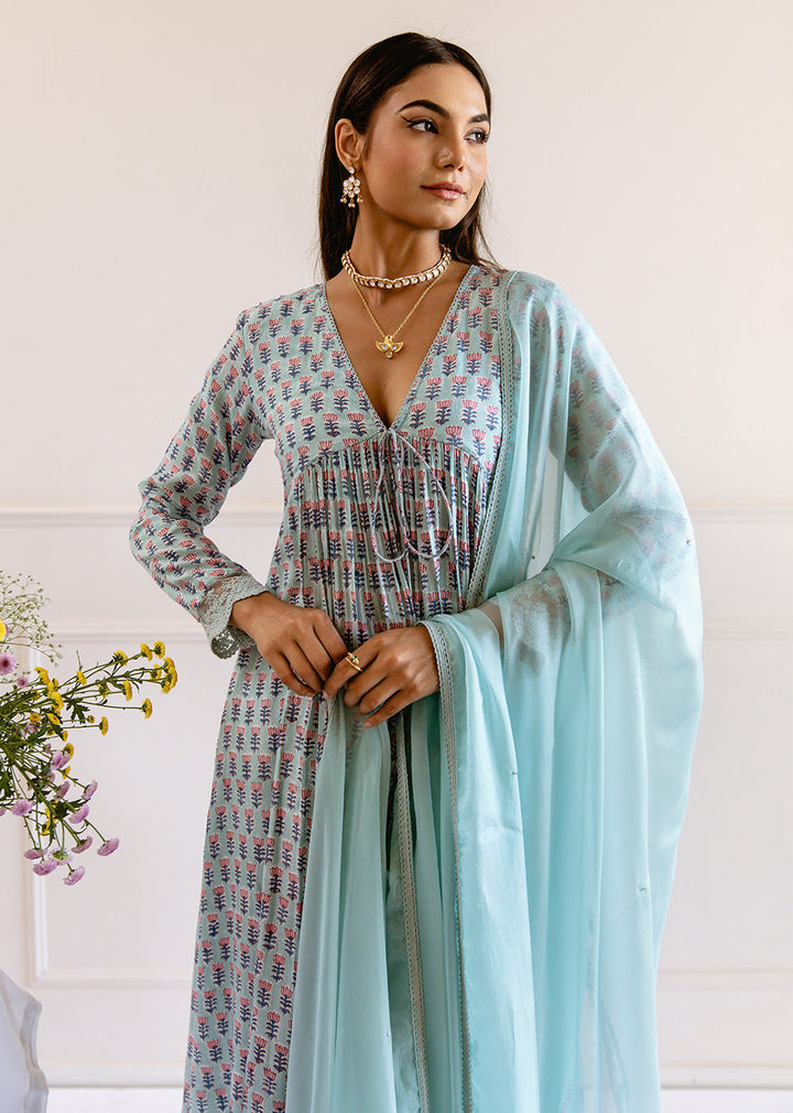This blue muslin silk anarkali kurta pant set has a front dori tie with hand-made tassels, a v-neck with delicate hand embroidery, waist gathers, and a cross-gather pattern. The sleeves have large lace details, which are matched with lace-edged pants and a dupatta that has lace detailing and thread embroidered designs all over it. NOTE: Kurta Length - 48" Dupatta Dimensions : 2.25*1.10 mtr approx (tabby silk dupatta)