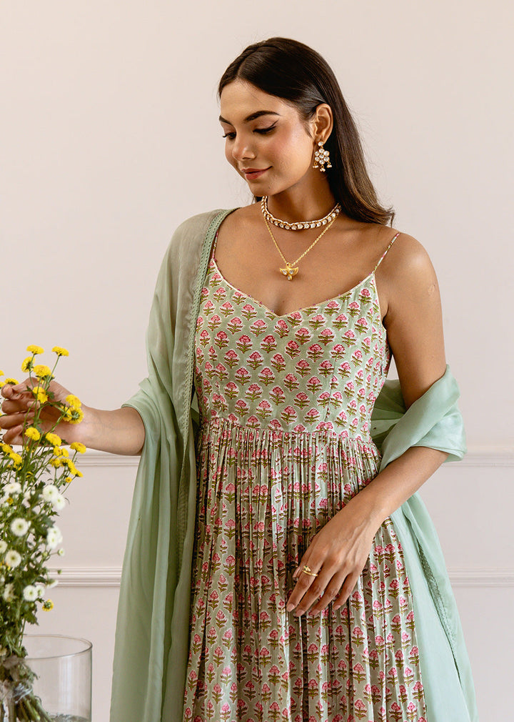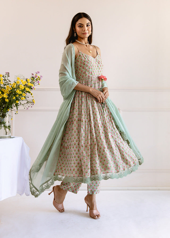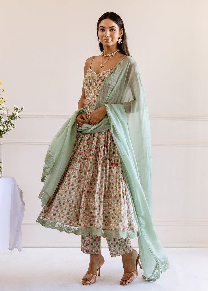 The sleeveless kurta in this classy green printed silk suit set has a paan neck design, moti details around the sides, and a deep back. It features matching bottoms, lace-trimmed borders, waist gathers, and a silk dupatta with thread embroidery and lace patterns. NOTE: Anarkali Length- 48" Dupatta Dimensions : 2.25*1.10 mtr approx (tabby silk dupatta)