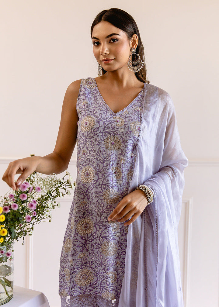 A muslin silk short sleeveless kurta in purple with lace trimming around the edges, worn with flared pants that go with it. The silk dupatta lends grace and charm to the outfit with its thread embroidery creates and lace designs. NOTE: Kurta Length - 40" Dupatta Dimensions : 2.25*1.10 mtr approx (tabby silk dupatta)