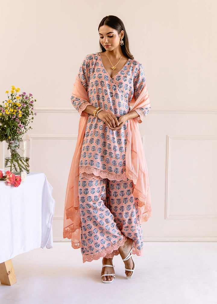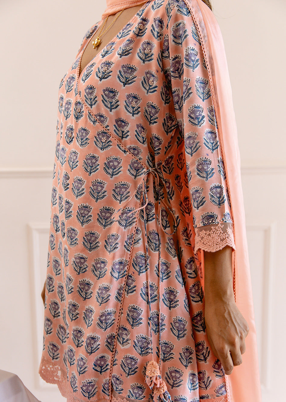 This peach-printed silk angrakha suit set has a side knot tie with a handcrafted tassel dori, a V-neck kurta with quarter sleeves, and lace and bead accents. The outfit is completed with matching palazzo bottoms and a silk dupatta embroidered with thread and lace. NOTE: Angrakha Length - 40" Dupatta Dimensions : 2.25*1.10 mtr approx (tabby silk dupatta)