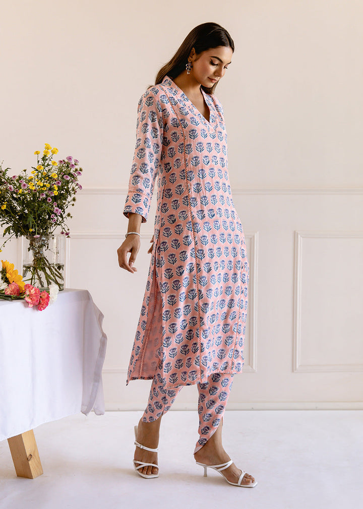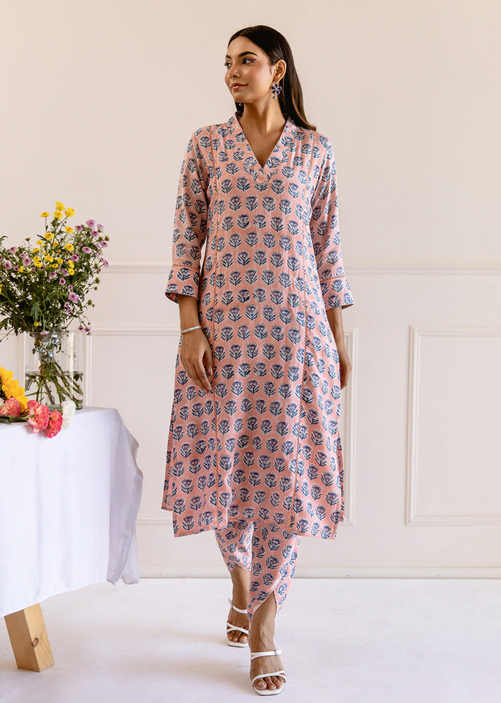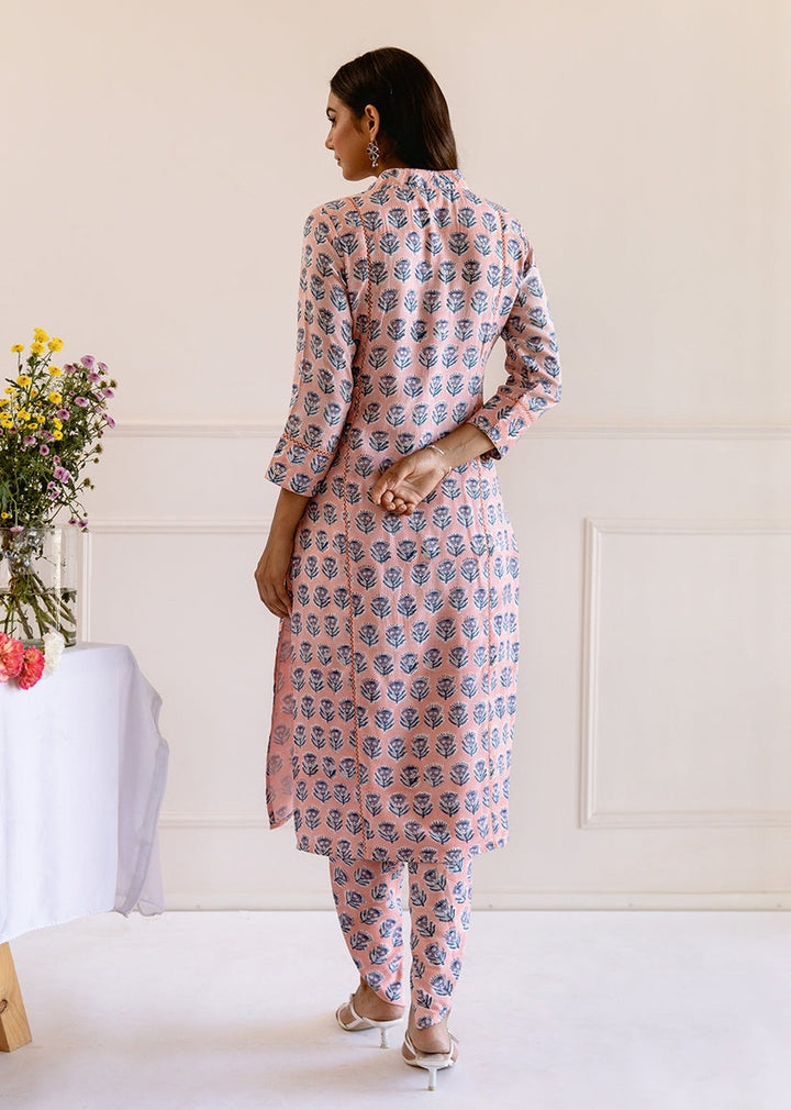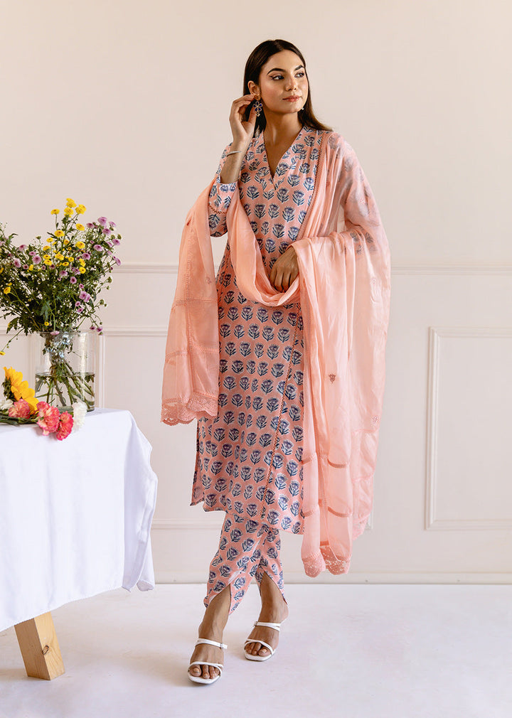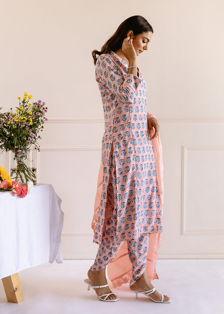 A silk suit set with a peach print includes a quarter-sleeve kurta with a collar neck, lace detailing, and moti accents on the sleeves and neck edges. Pair with matching tulip pants. Completing the look are silk dupatta with thread embroidery and lace trimming. NOTE: Kurta Length - 46" Dupatta Dimensions : 2.25*1.10 mtr approx (tabby silk dupatta)