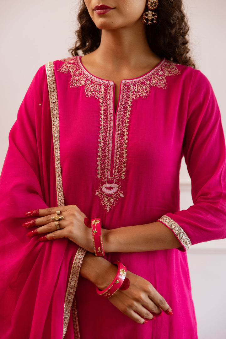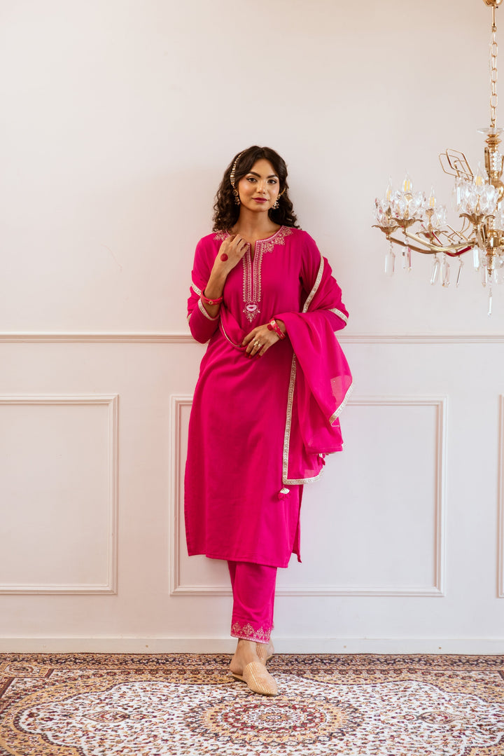 Our rani pink mulmul suit set featuring a straight-fitting kurta with a round neckline, three-quarter sleeves, pocket detailing, zari lace, and sequins, matching straight pants, a dupatta finished with exquisite gotta patti, and tassel accents. NOTE: Dimensions : 2.25*1.10 mtr approx Length : Kurta Length - 46"