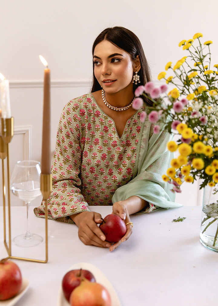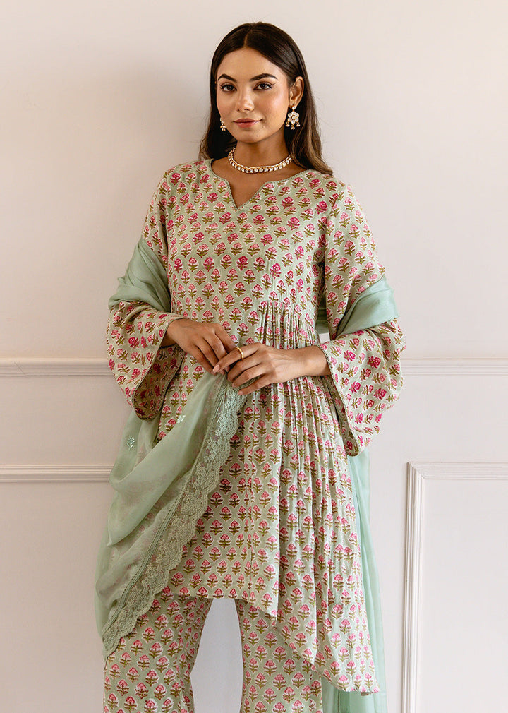 This green muslin silk kurta pant set looks amazing with its machine embroidery on the short kurta, side gathers, gotta detailing, notch neck, and flared sleeves with lace trimming. Included are matching flared pants. Dupatta with a thread pattern and lace at corners. NOTE: Kurta Length- 40" Dupatta Dimensions : 2.25*1.10 mtr approx (tabby silk dupatta)