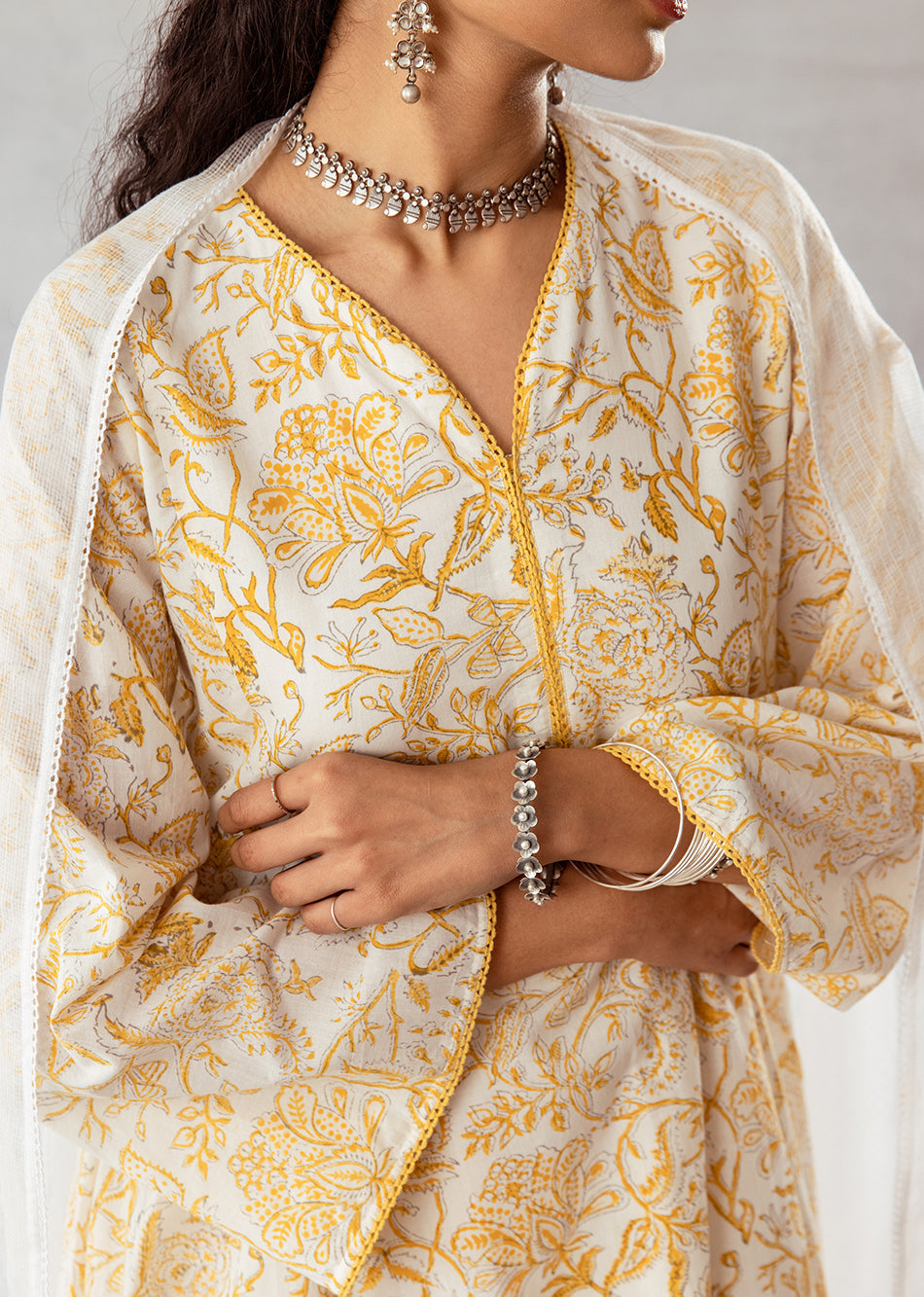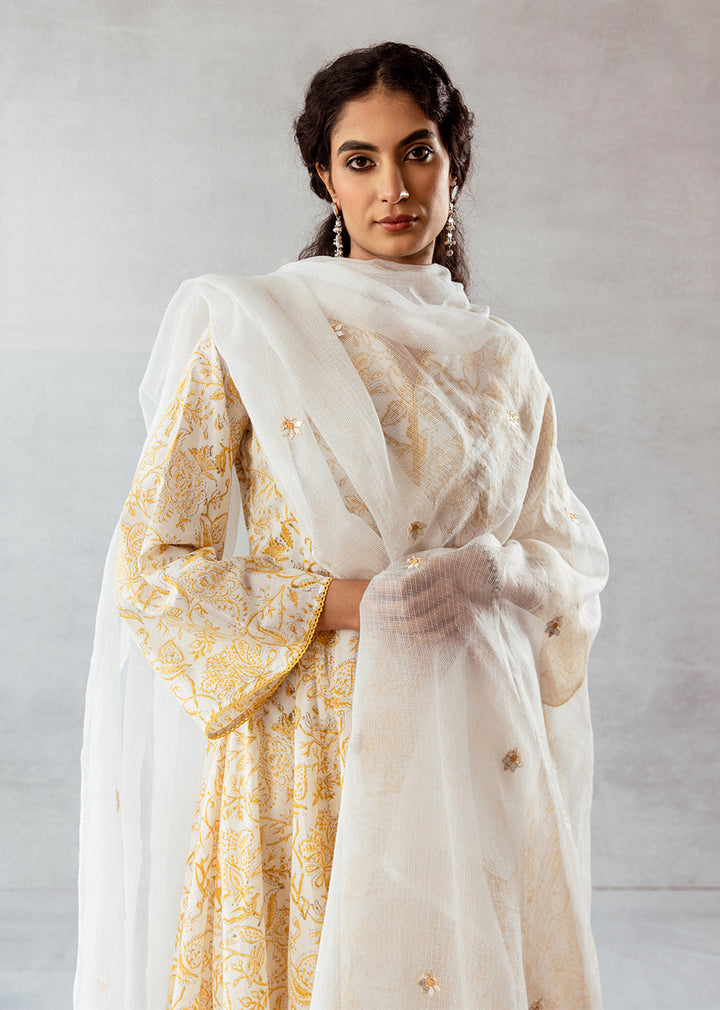 A yellow printed anarkali kurta with matching printed pants, a pleated style, flared sleeves, and lace shaping. A white Kota Doria dupatta with lace edging, floral tassels, and tiny thread embroidery designs completes the look. NOTE: Anarkali Length - 46" Dupatta Dimensions : 2.25*1.10 mtr approx