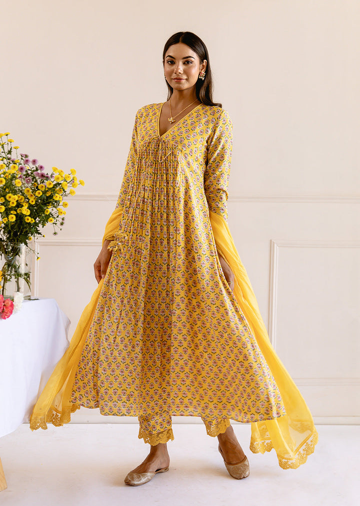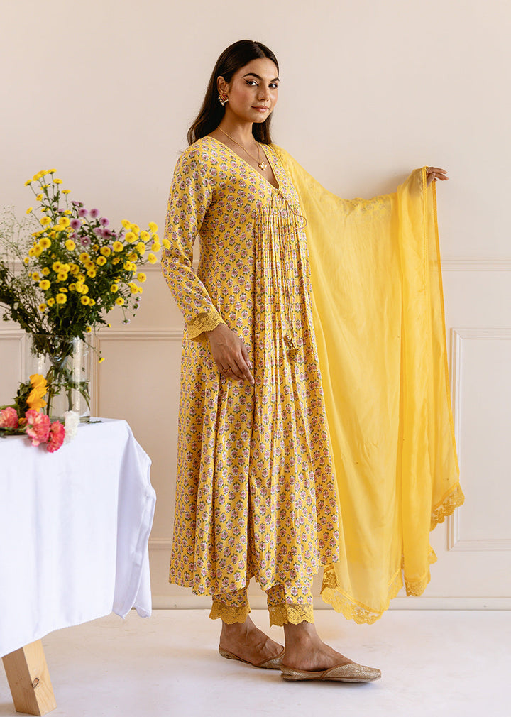 The yellow anarkali kurta pant set made of muslin silk has a front dori tie with hand-made tassels, a V-neck kurta with hand embroidery, and cross gathers at the waist. It has big lace details on the sleeves, matching pants, and a lace and thread-embroidered dupatta. NOTE: Kurta Length - 48" Dupatta Dimensions : 2.25*1.10 mtr approx (tabby silk dupatta)