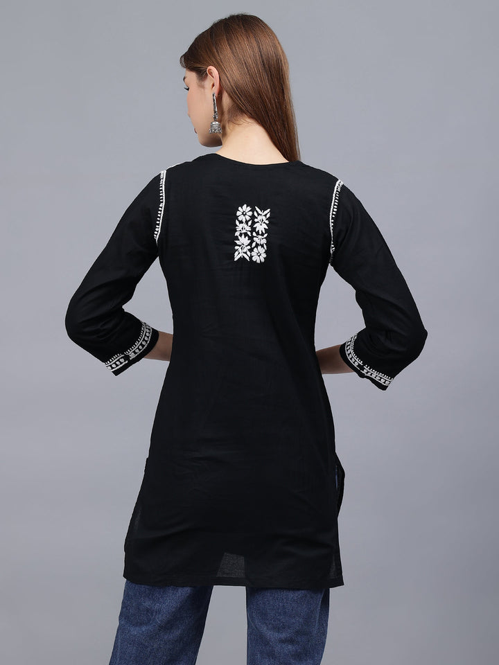 Length: 31 Inches Neck: Round-shape Sleeves: 3/4 Sleeves Slit Detail: Straight Embroidery: Ghaspatti, Phanda Thread Color: WhiteMaterial & Care: