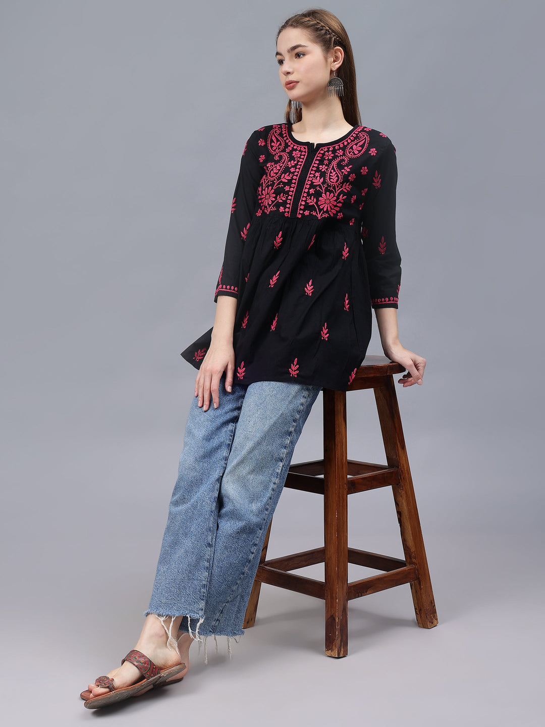 This is a Black Cotton Embroidery Chikankari A-Line Top