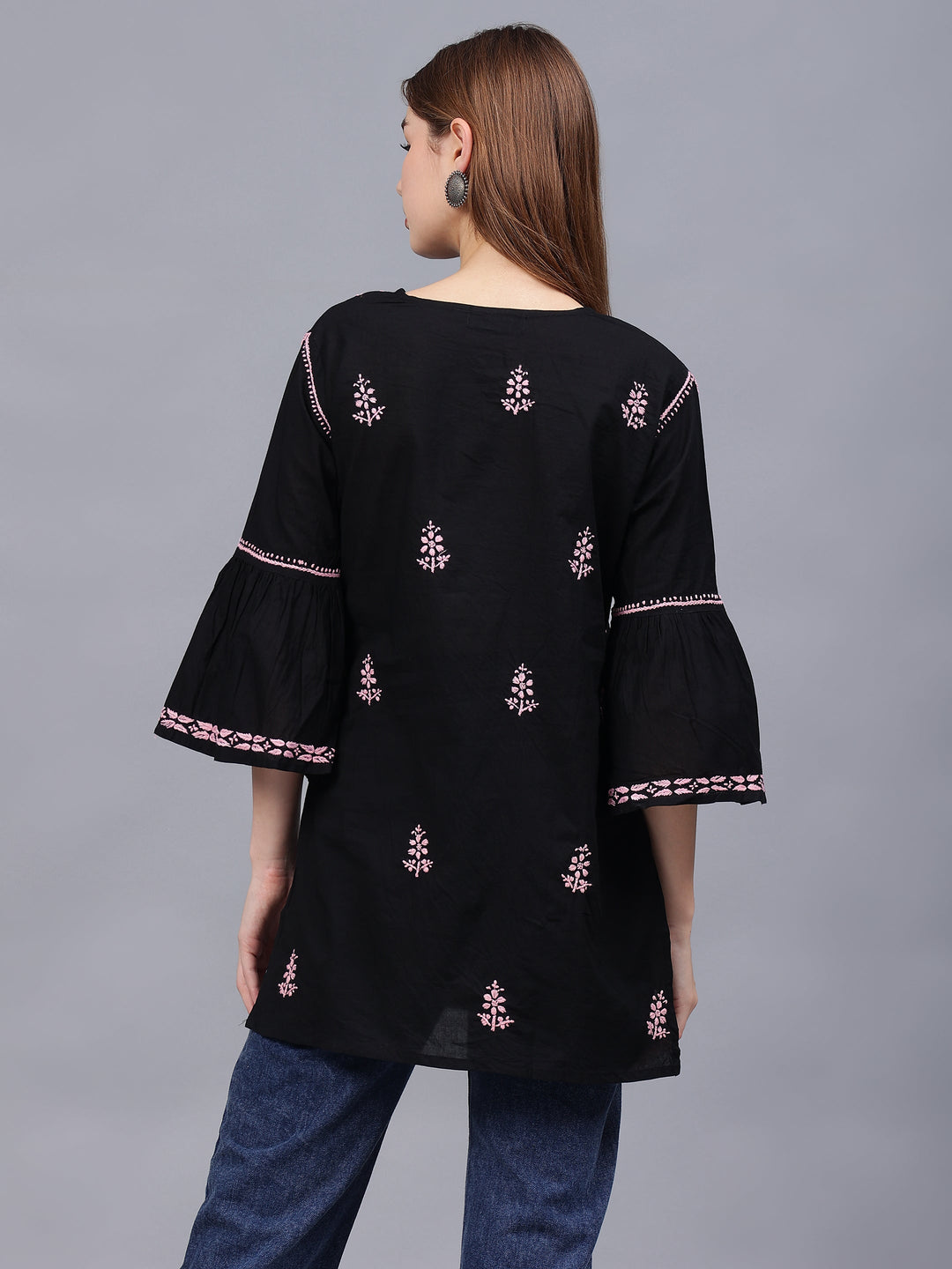This is a Black Cotton Embroidered Round Neck Chikankari Tunic