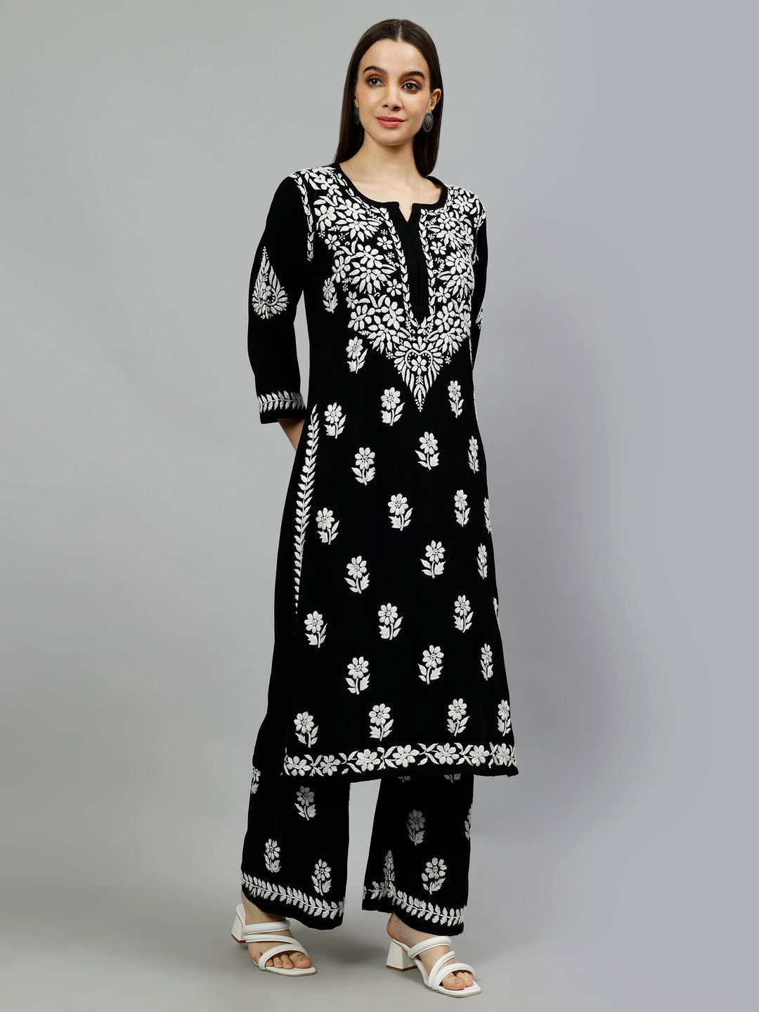 This Is A Black Rayon Embroidered Chikankari Kurta & Palazzo Set Following Are The Features Of This Product: -Length Of Kurta: 45 Inches -Length Of Trouser: 36 Inches -Neck: Round-Shape -Sleeves: Bell-Sleeves -Shape: Straight -Slit Detail: Side Slit -Embroidery: Ghaspatti & Phanda -Thread: Cotton -Thread Color: White