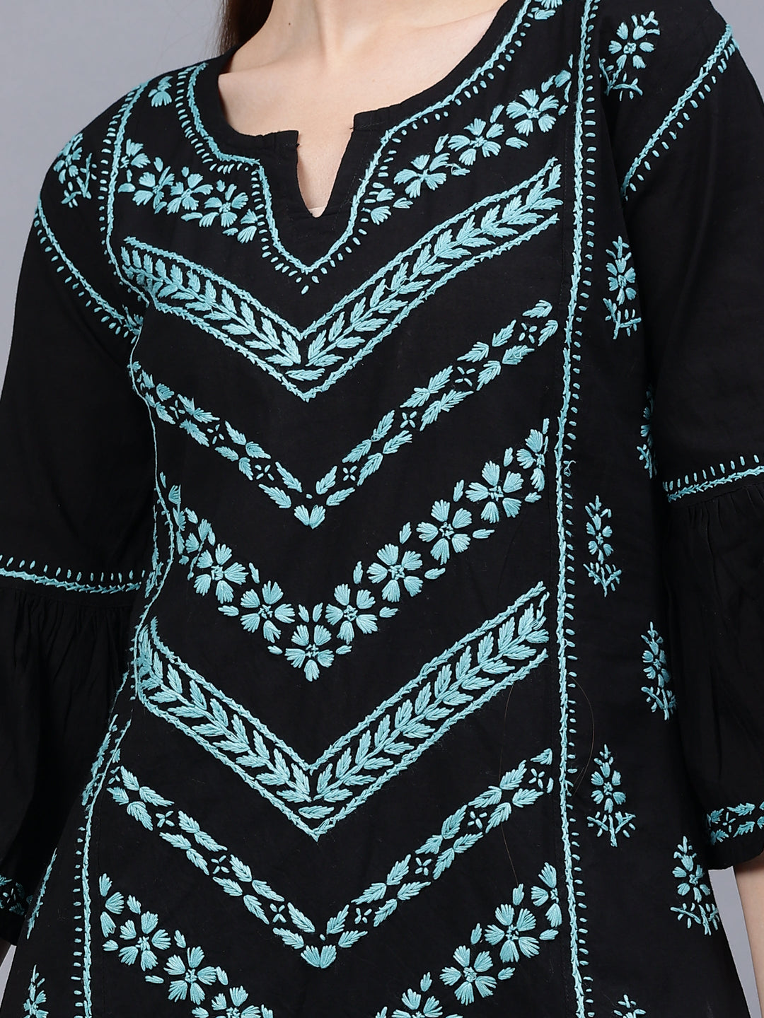 Length: 31 Inches Neck: Round-shape Sleeves: 3/4 Sleeves Slit Detail: Straight Embroidery: Ghaspatti, Phanda Thread Color: TurquoiseMaterial & Care: