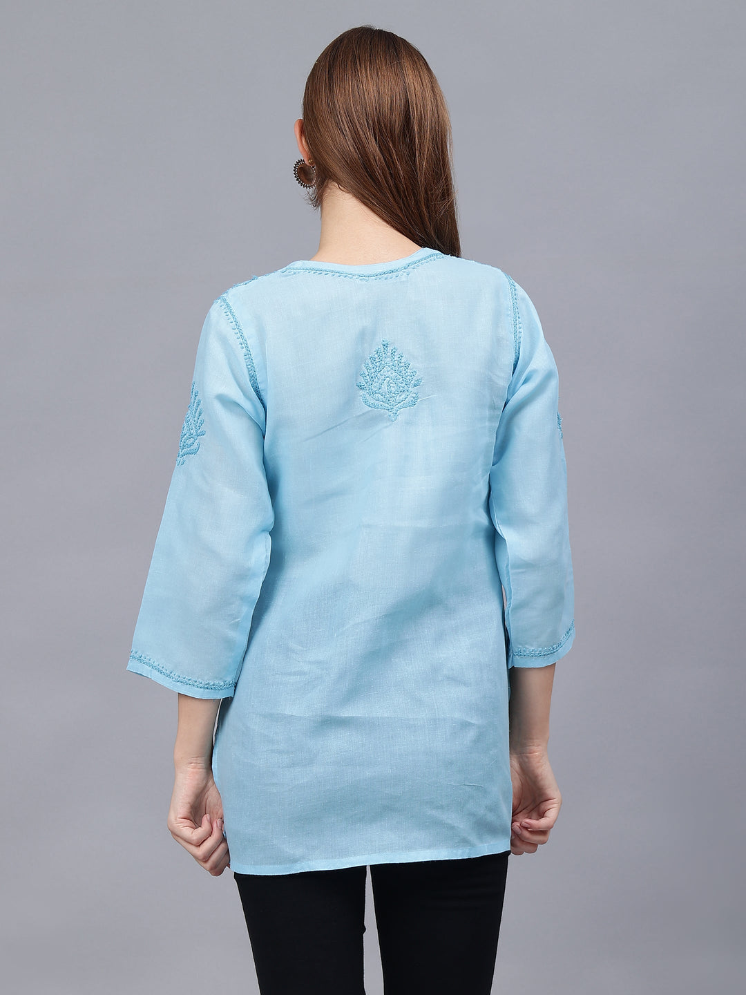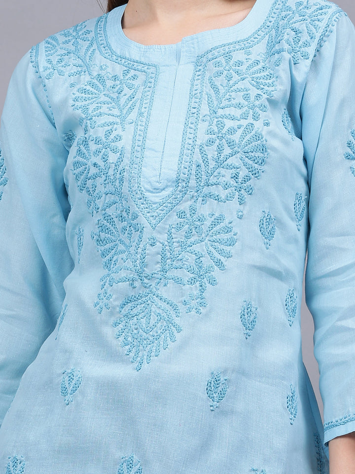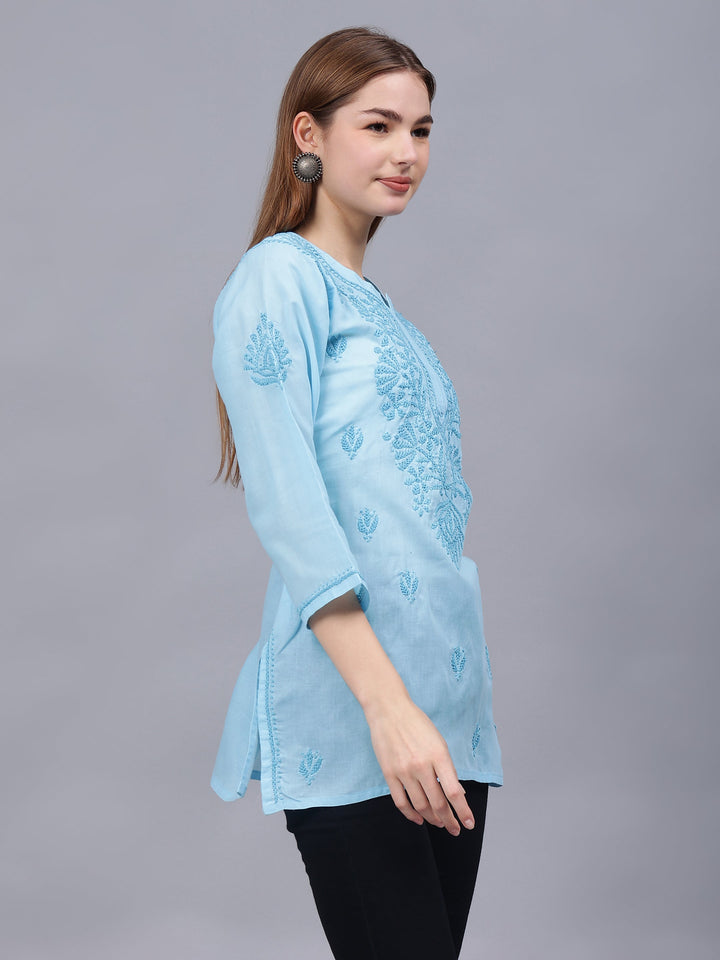 This is a Blue Cotton Embroidered Chikankari Tunic