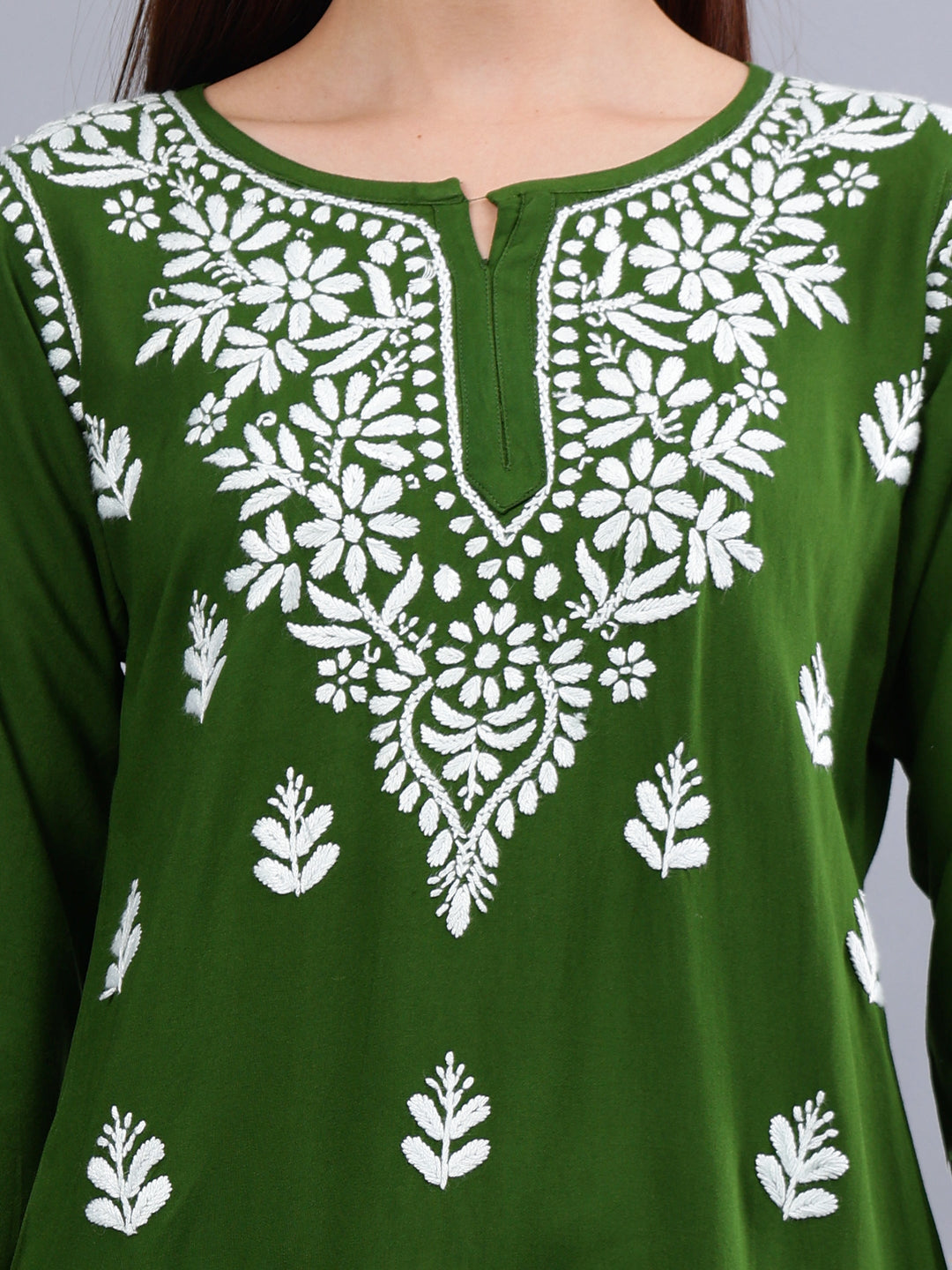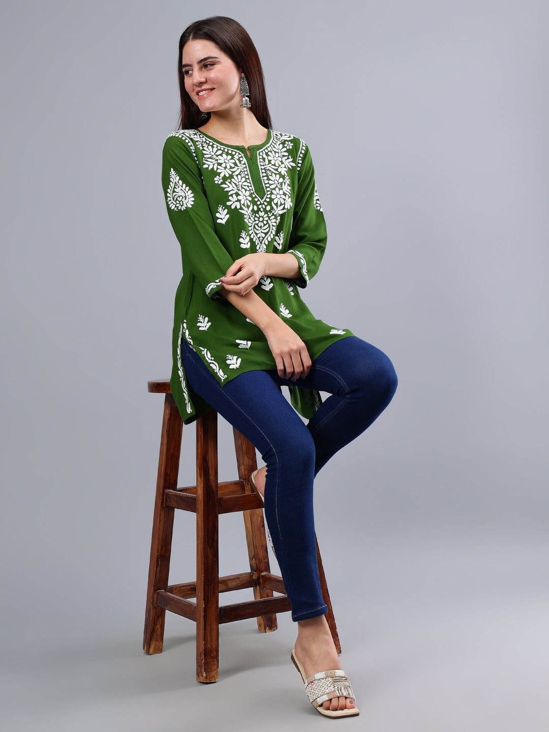 This is a Dark Green Rayon Embroidered Chikankari Short Tunic