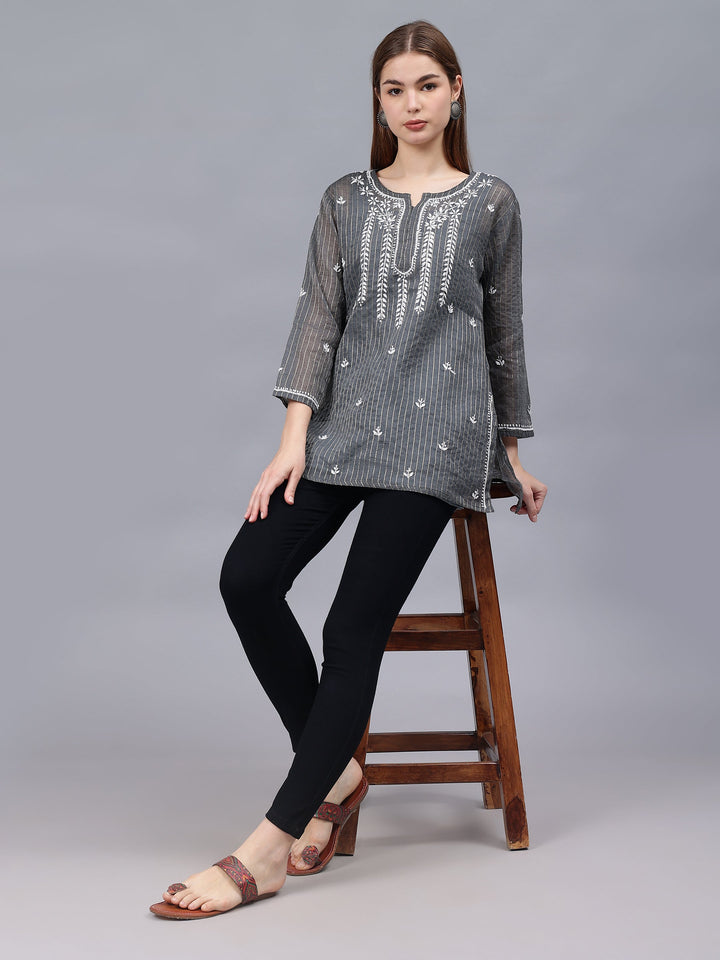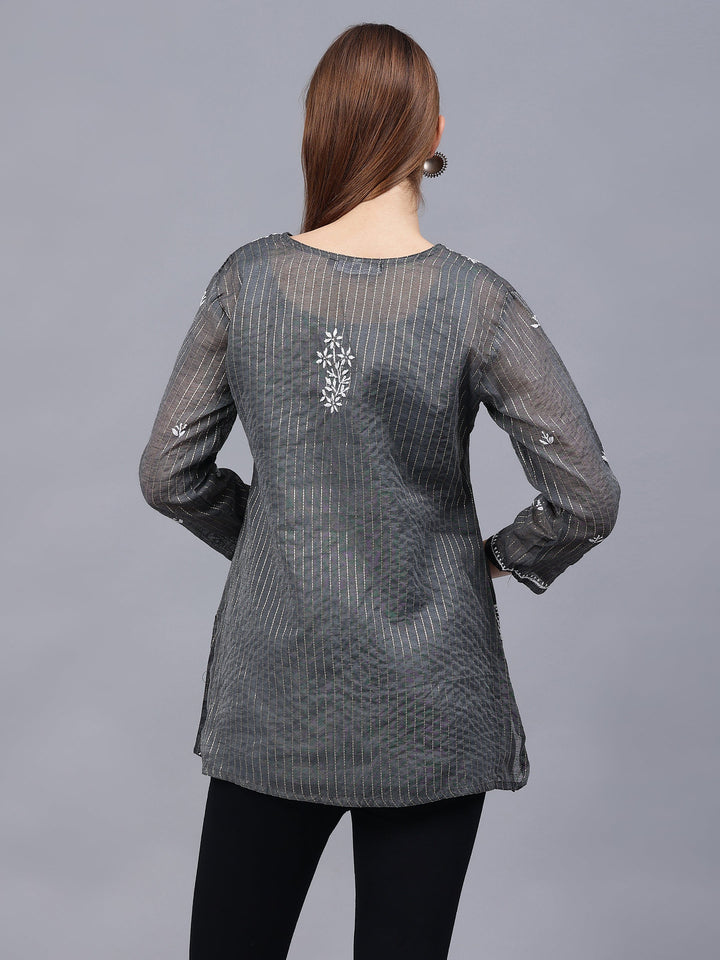 This is a Grey Chanderi Embroidered Chikankari Tunic With Slip