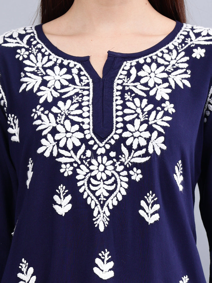This is a Navy Blue Rayon Embroidered Chikankari Short Tunic
