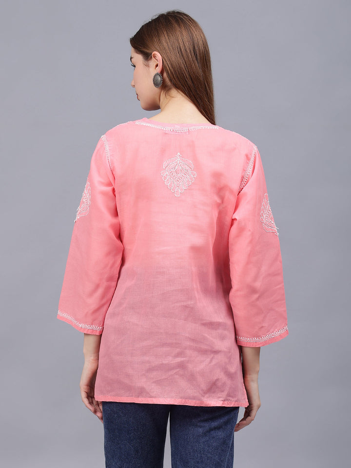 This is a Peach Terivoil Cotton Embroidered Chikankari Tunic