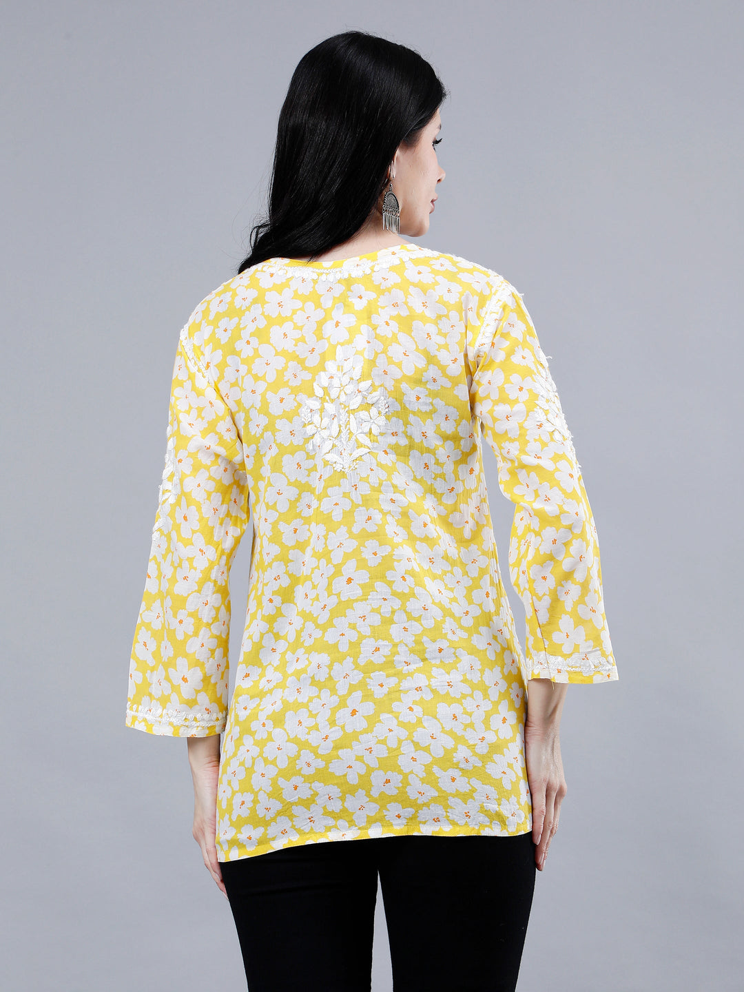 This is a Yellow Mulmul Embroidered Chikankari Short Tunic