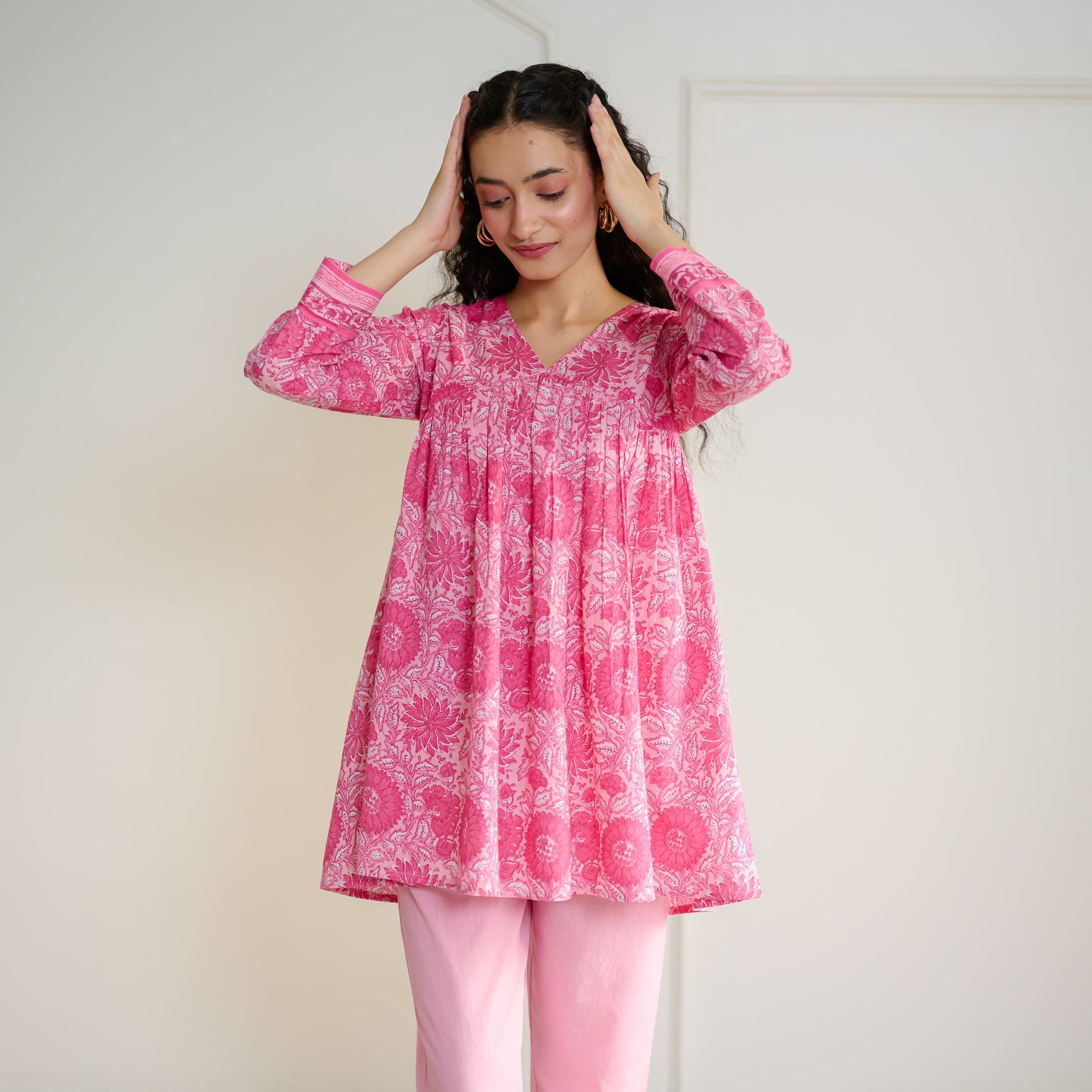 Inspired by timeless Sanganeri prints, this co-ord set blends elegance with everyday comfort. The cotton tunic features a flattering fit-and-flare silhouette that flows gracefully, paired with straight pants for a balanced look. Breathable and easy to style, it’s perfect for casual outings or relaxed gatherings where tradition meets effortless charm.