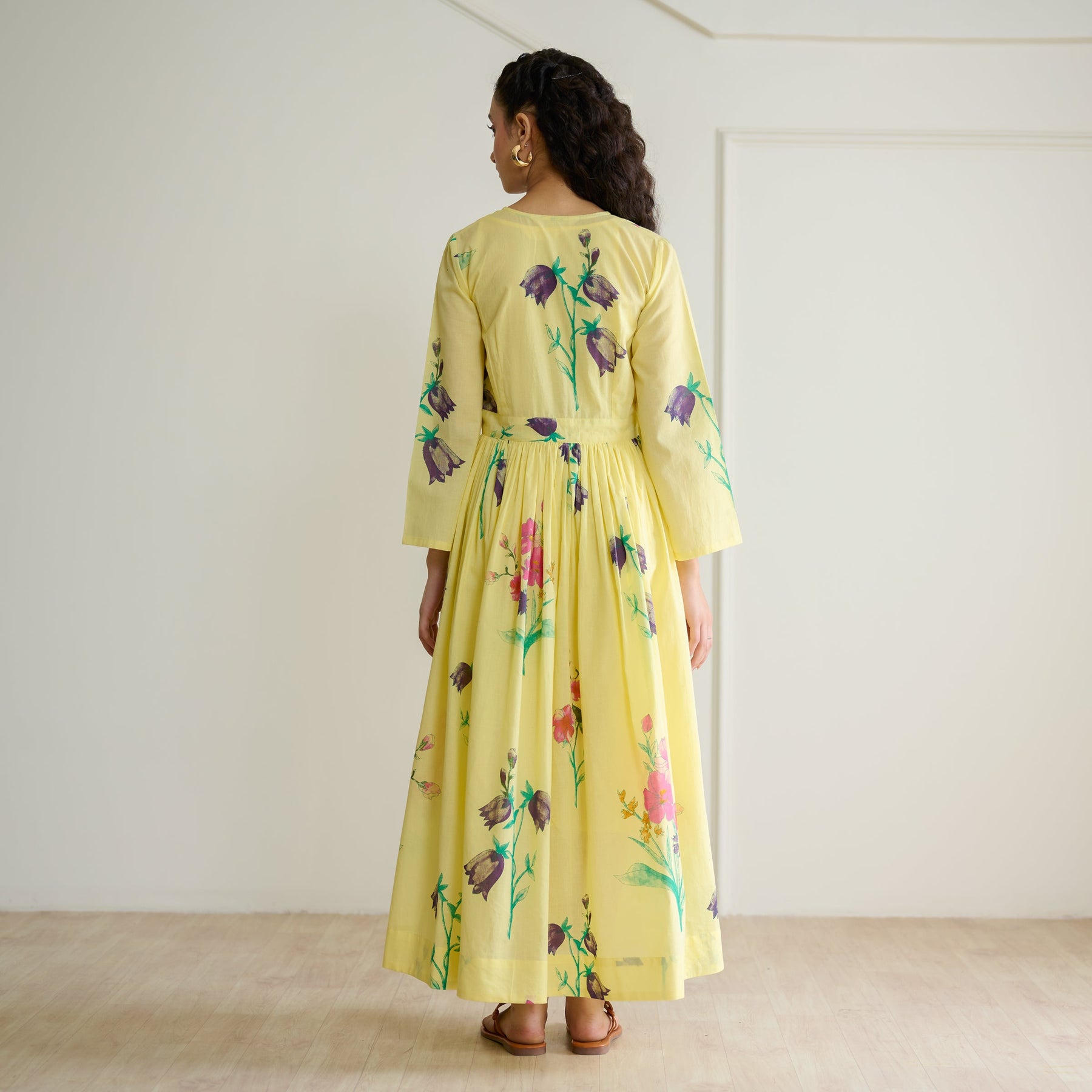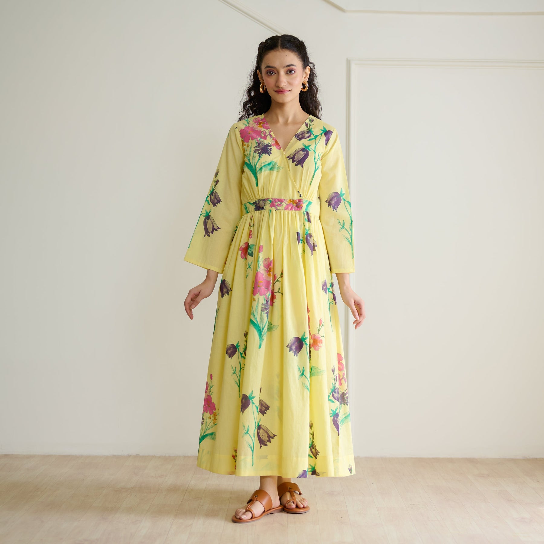 Bring sunny elegance to your wardrobe with this fit-and-flare cotton dress featuring a charming printed overlap design. The fabric button and tic tac closure enhance its delicate style, while the detachable mulmul slip ensures comfort and opacity. Ideal for day events or casual get-togethers where comfort meets effortless sophistication. Specifications: Dress: Cotton | Slip: Mulmul