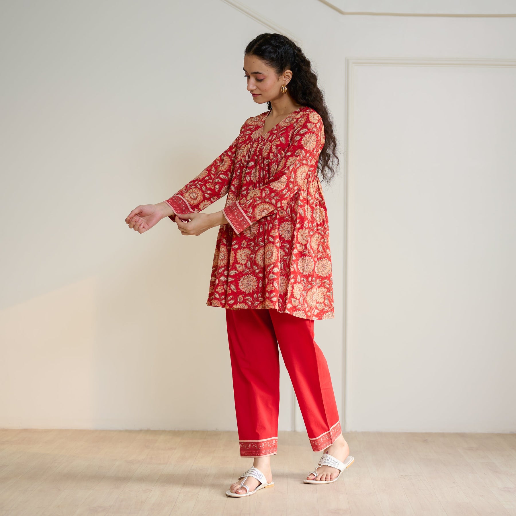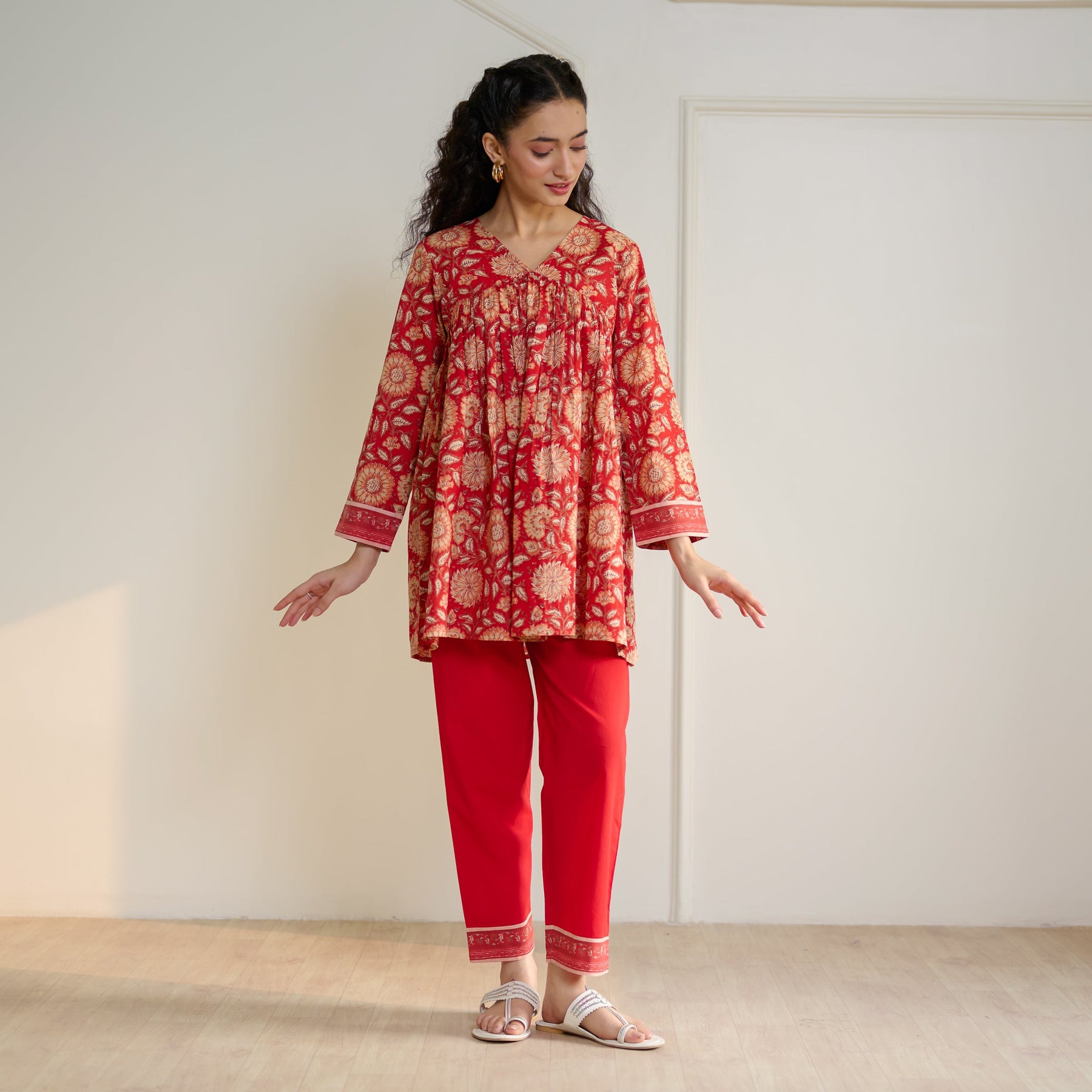 Graceful, vibrant, and effortlessly chic, the Jugni Sanganeri Inspired Co-ord Set celebrates timeless prints in a modern silhouette. Crafted from 100% cotton, the tunic features a flattering fit and flare shape that moves beautifully, paired with classic straight pants for balanced elegance. Designed with Sanganeri-inspired motifs, this ensemble blends traditional artistry with contemporary ease — perfect for casual days, festive moods, or relaxed get-togethers.