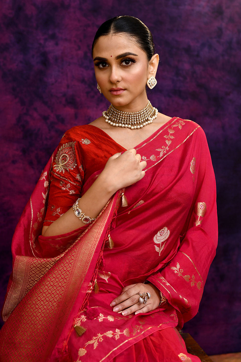 Pure Banarasi woven silk saree with zari & minakari leaf motifs & hand embroidered blouse-Fuschia pink