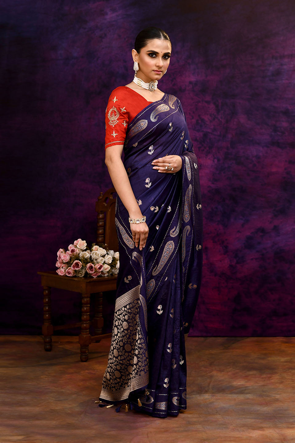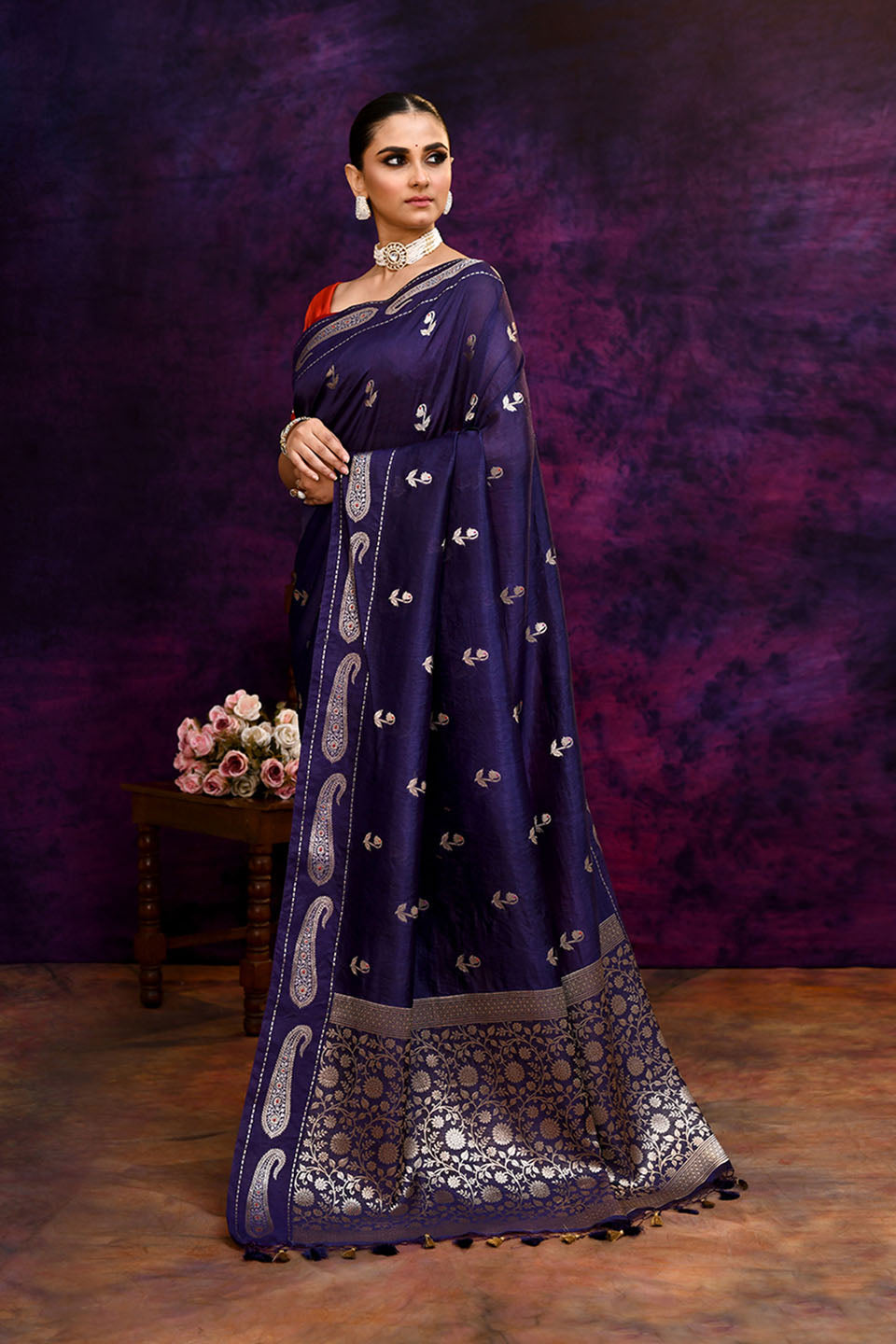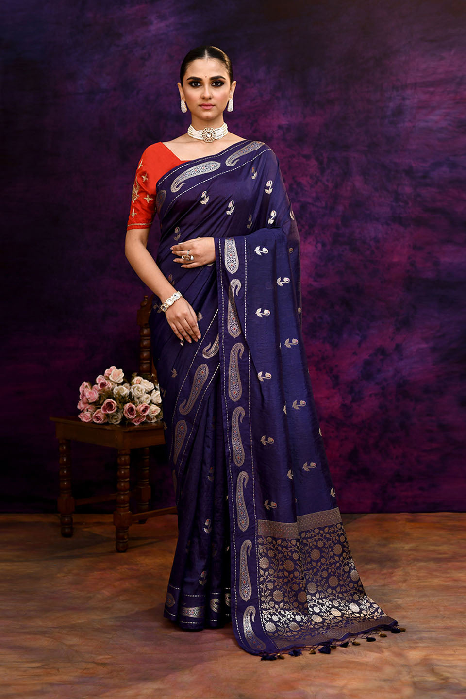 Pure Banarasi woven silk saree with zari & minakari mango motifs & hand embroidered blouse-Indigo blue