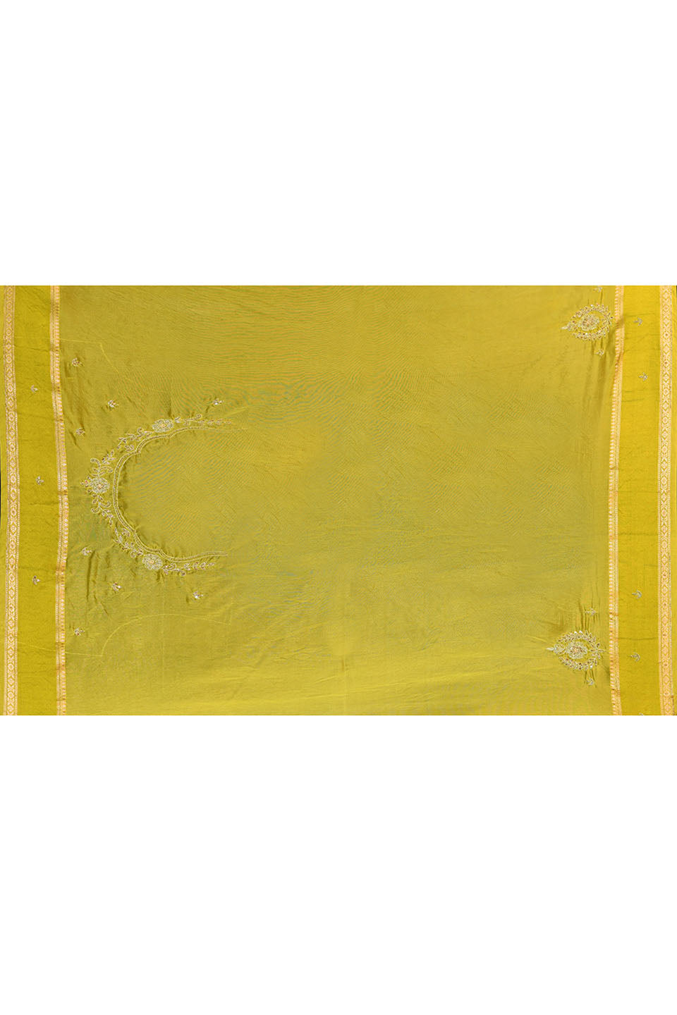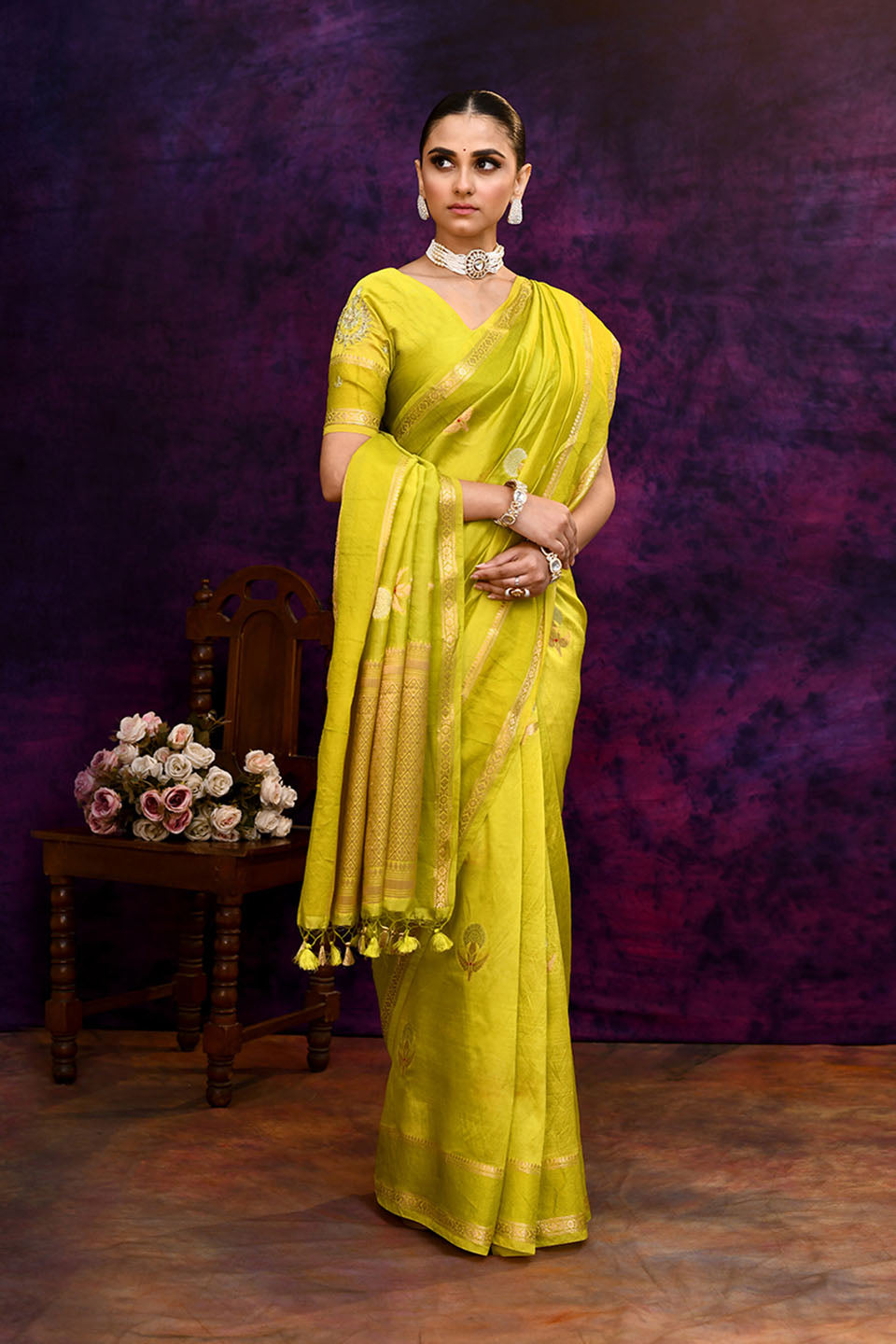 Pure Banarasi woven silk saree with zari weaving & hand embroidered blouse-Lime green
