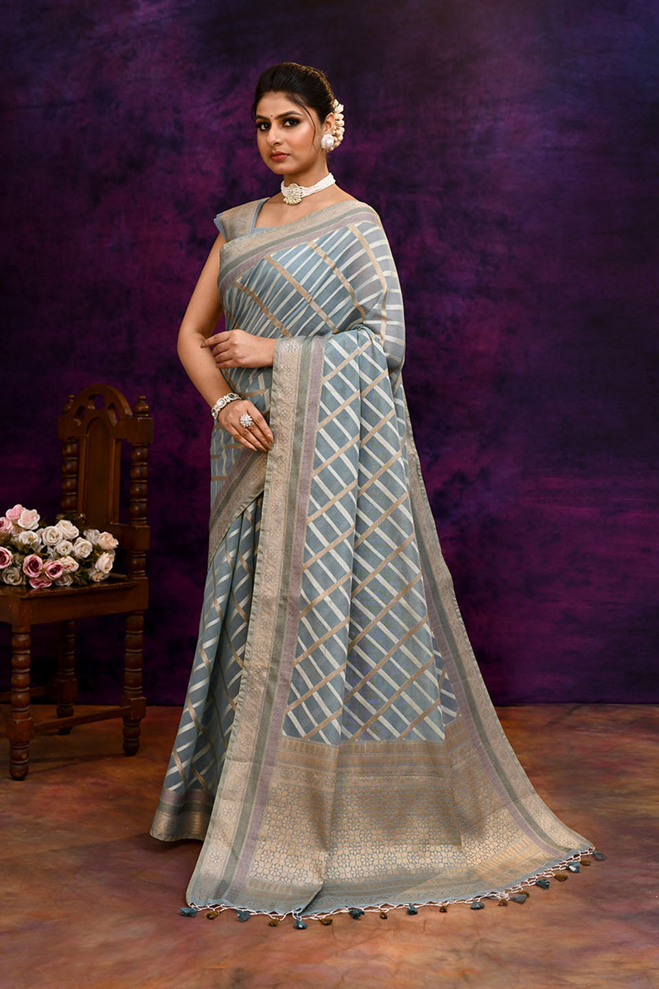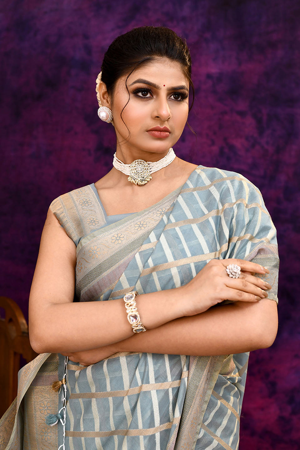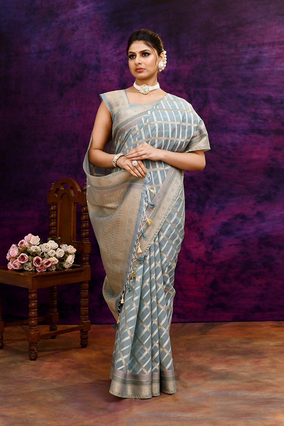 Cotton saree with golden zari banarasi border and motifs- Checkered pattern-Powder Blue