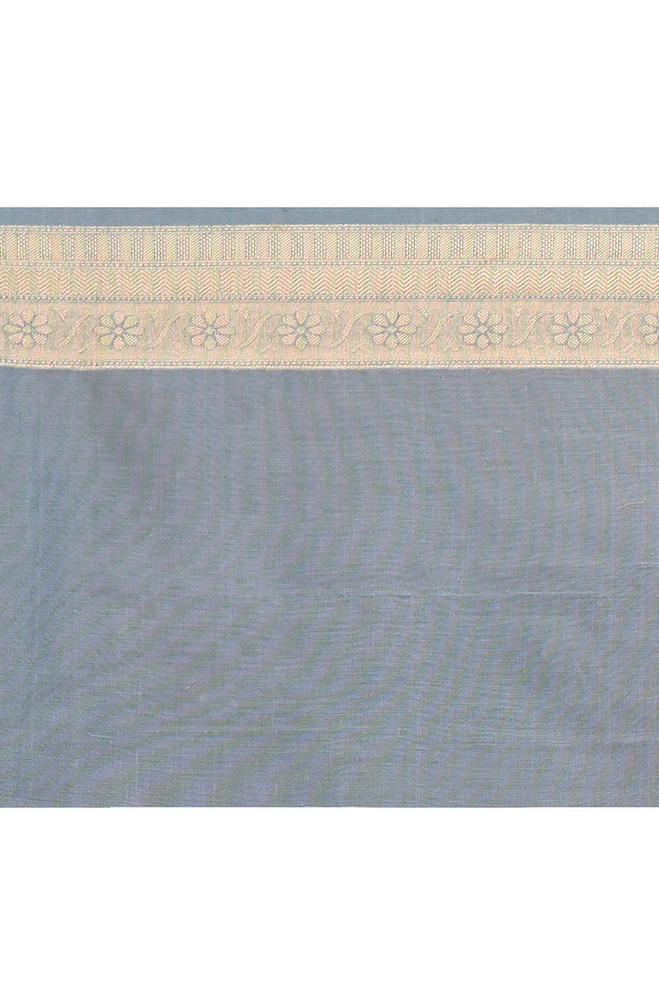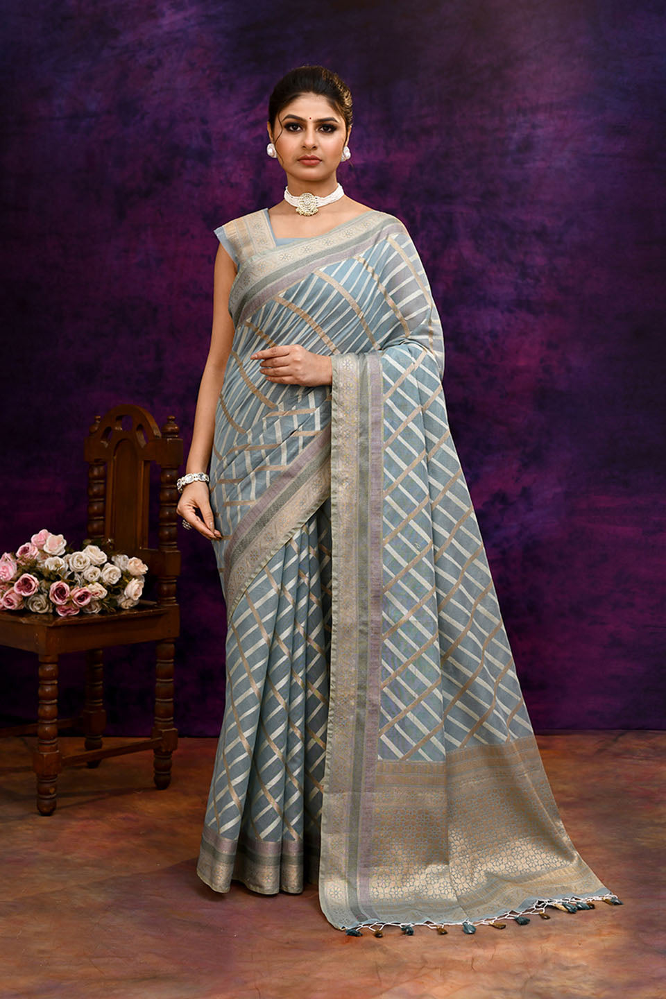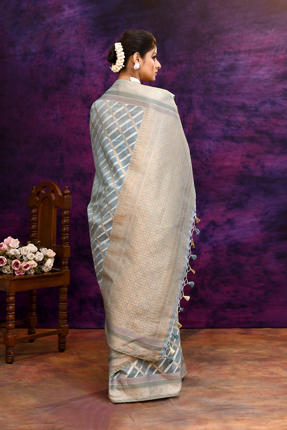 Cotton saree with golden zari banarasi border and motifs- Checkered pattern-Powder Blue