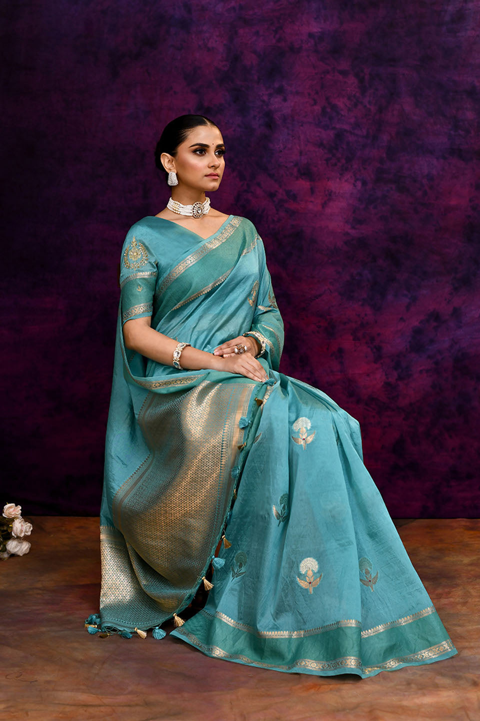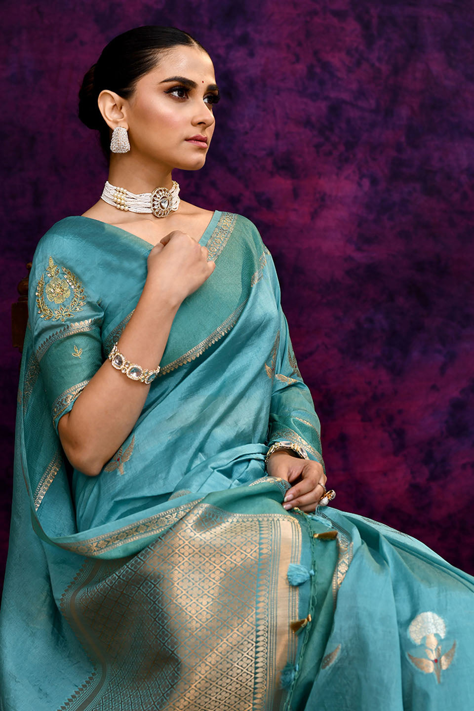 Pure Banarasi woven silk saree with zari weaving & hand embroidered blouse-Turquoise blue