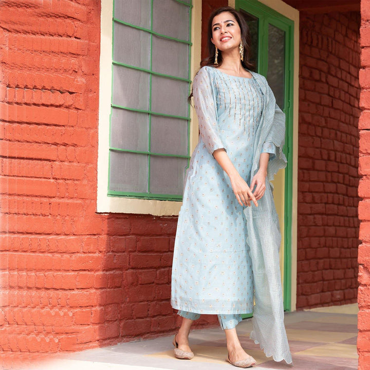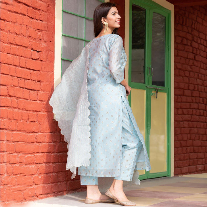 A Classy And Elegant Chanderi Suit Set, Perfect For Functions And Family Gatherings. The Kurta Features Golden Gota Work On The Bodice With Delicate Floral Motifs Scattered Across The Kurta And Pants. It Is Paired With Straight Pants And A Matching Shawl For A Complete Festive-Ready Look. Neckline: Boat Neck | Sleeve: 3/4 Length (18") | Kurta Length: 50" | Pant Length: 40" | Pattern: Straight | Occasion: Festive & Family Gatherings | Technique: Gota Work & Floral Motifs