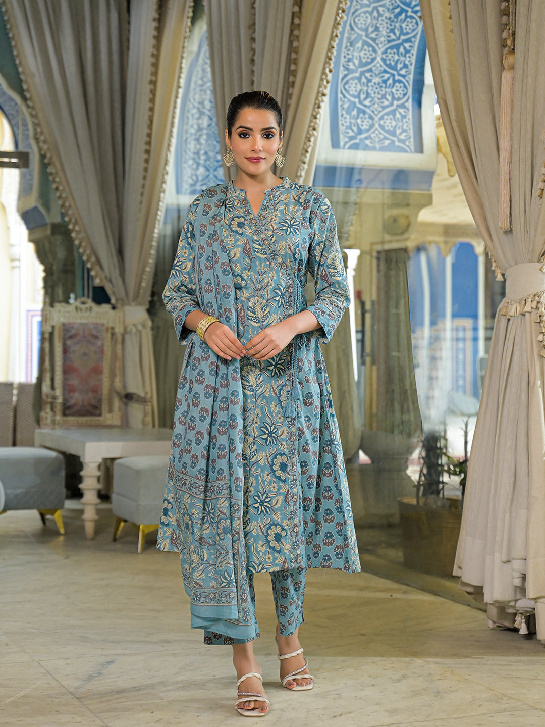 Blue-Cotton-Floral-Print-A-Line-3-Piece-Kurta-Set