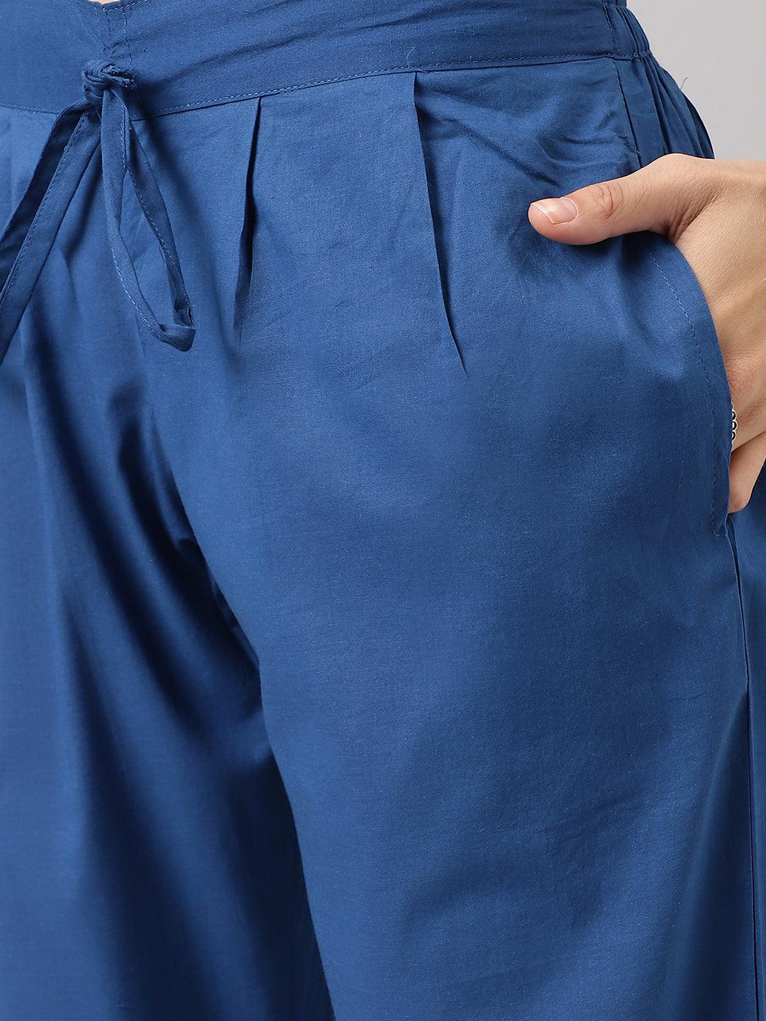 Refreshing And Vibrant, This Blue Cotton Straight Kurta Is Detailed With Thread Work On The Round Neck And Tassels On The Side Slits. Comes With A Solid Trouser And A Soft Dupatta For An Easy Festive Look. Specifications Color: Blue | Neck: Round Neck | Print: Floral | Hemline: Straight | Sleeve: Three-Quarter Regular | Slit: Side Slits | Kurta Length: Knee Length | Top Fabric: Pure Cotton | Bottom Fabric: Pure Cotton | Bottom Type: Trouser | Dupatta: Included