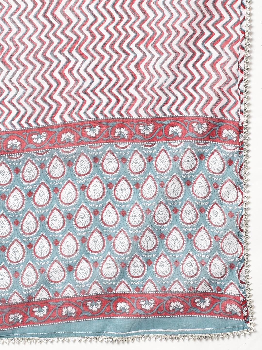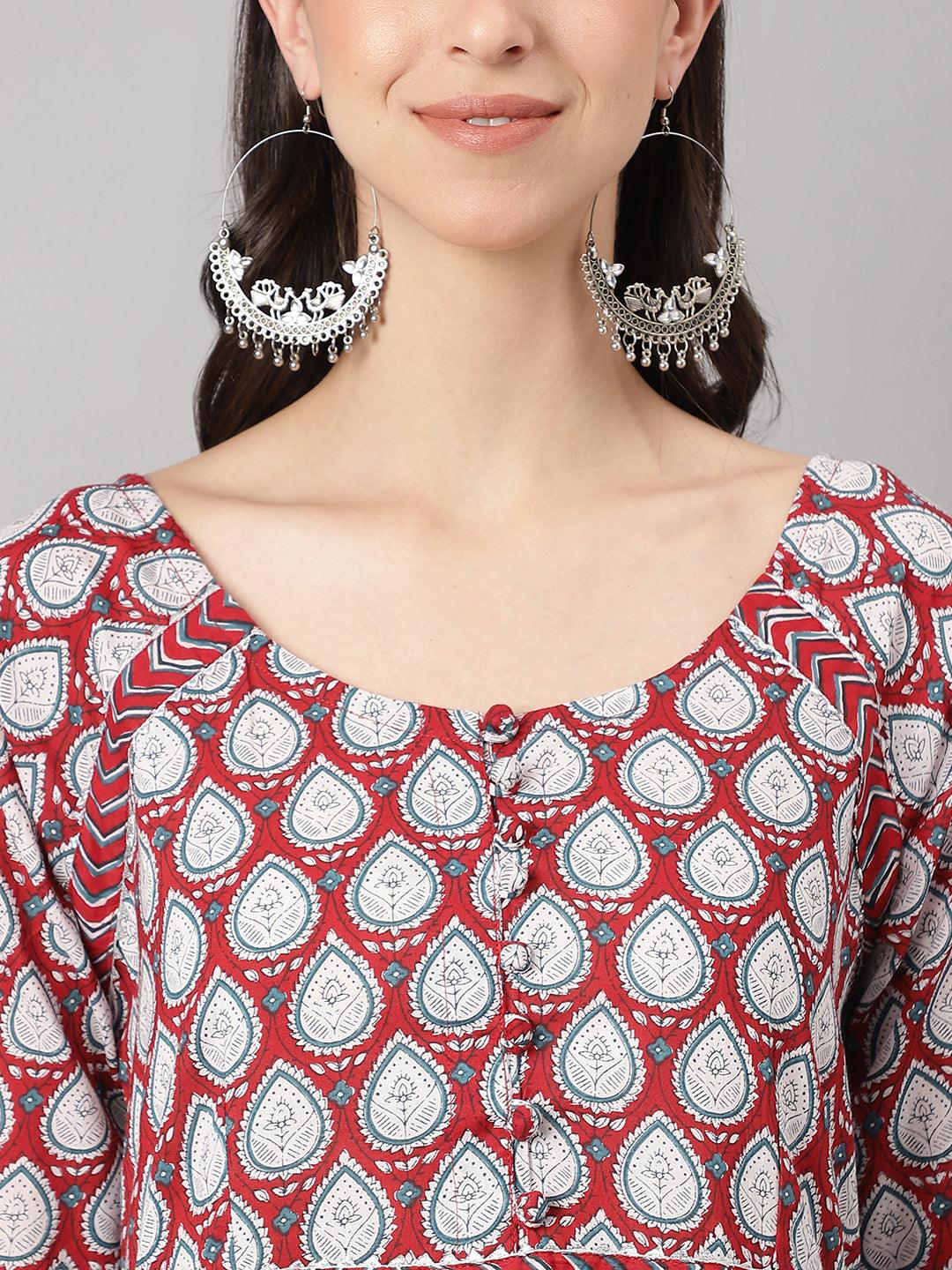 A Festive-Ready Maroon Cotton Anarkali Featuring Ethnic Buti Prints, Gota Patti Work, And A Unique Zigzag Flap At The Hem. Paired With Printed Trousers And A Cotton Dupatta For A Complete Ethnic Look. Specifications Color: Maroon | Neck: Round Neck | Print: Ethnic Buti | Hemline: Curved | Sleeve: Three-Quarter Regular | Slit: None | Kurta Length: Calf Length | Top Fabric: Pure Cotton | Bottom Fabric: Pure Cotton | Bottom Type: Trouser | Dupatta: Cotton