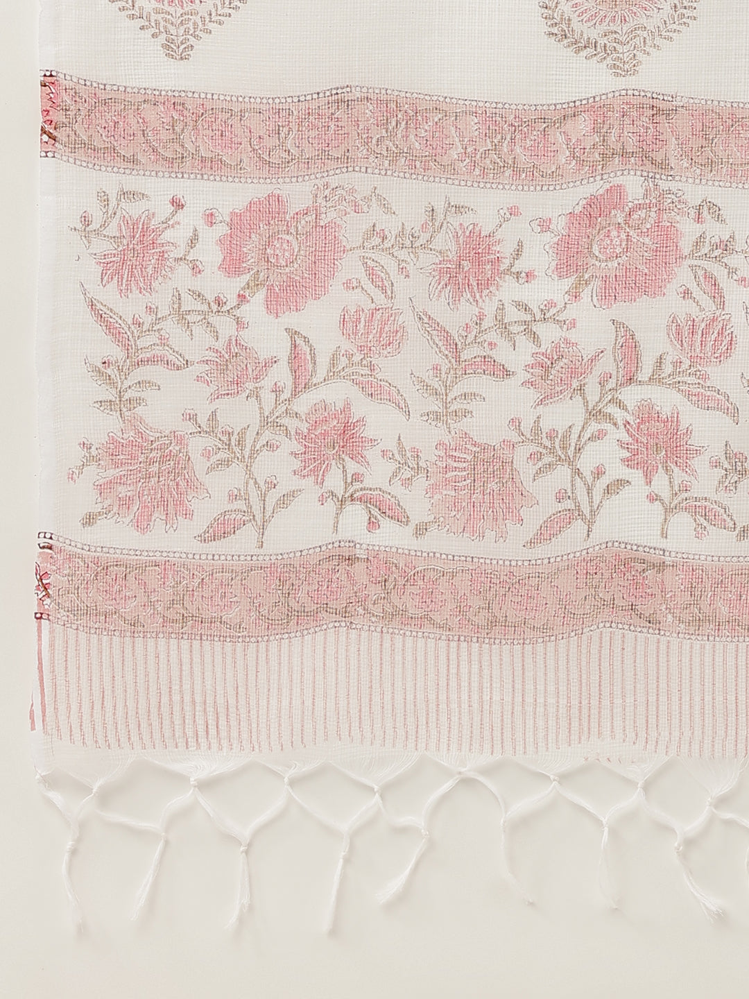 Bring A Touch Of Traditional Charm With This Pink Handblock Printed Anarkali Kurta Set. Featuring A Mandarin Collar, Flared Hemline, And Three-Quarter Sleeves, It Is Paired With Matching Floral Printed Pants And A Breezy Kota Doria Dupatta For A Festive Yet Comfortable Look. Specifications Color: Pink | Neck: Mandarin Collar | Print: Floral Handblock | Hemline: Flared | Sleeve: Three-Quarter Regular | Slit: No Slits | Kurta Length: Knee Length | Top Fabric: Cotton | Bottom Fabric: Cotton | Bottom Type: Pant | Dupatta: Kota Doria