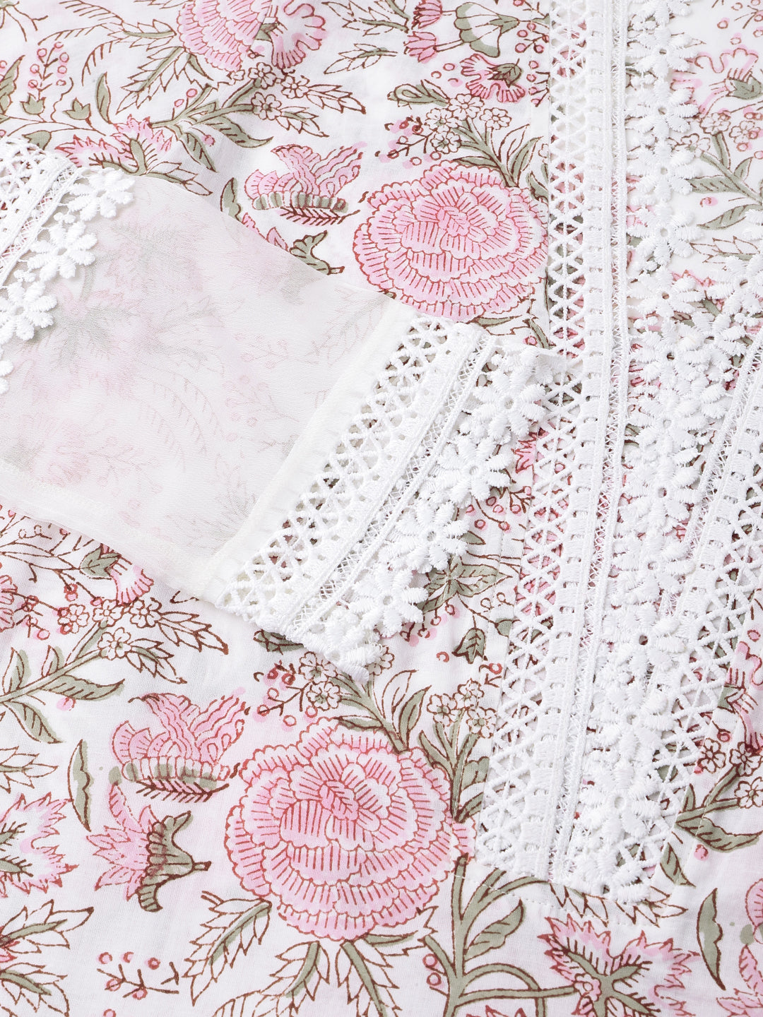 Elegant White Hand Block Printed Straight Kurta With Full Sleeves And Side Slits, Paired With Matching Printed Pants And A Soft Cotton Dupatta For Timeless Festive Appeal. Top: Cotton | Bottom: Cotton Hand Block Printed Pant | Dupatta: Cotton