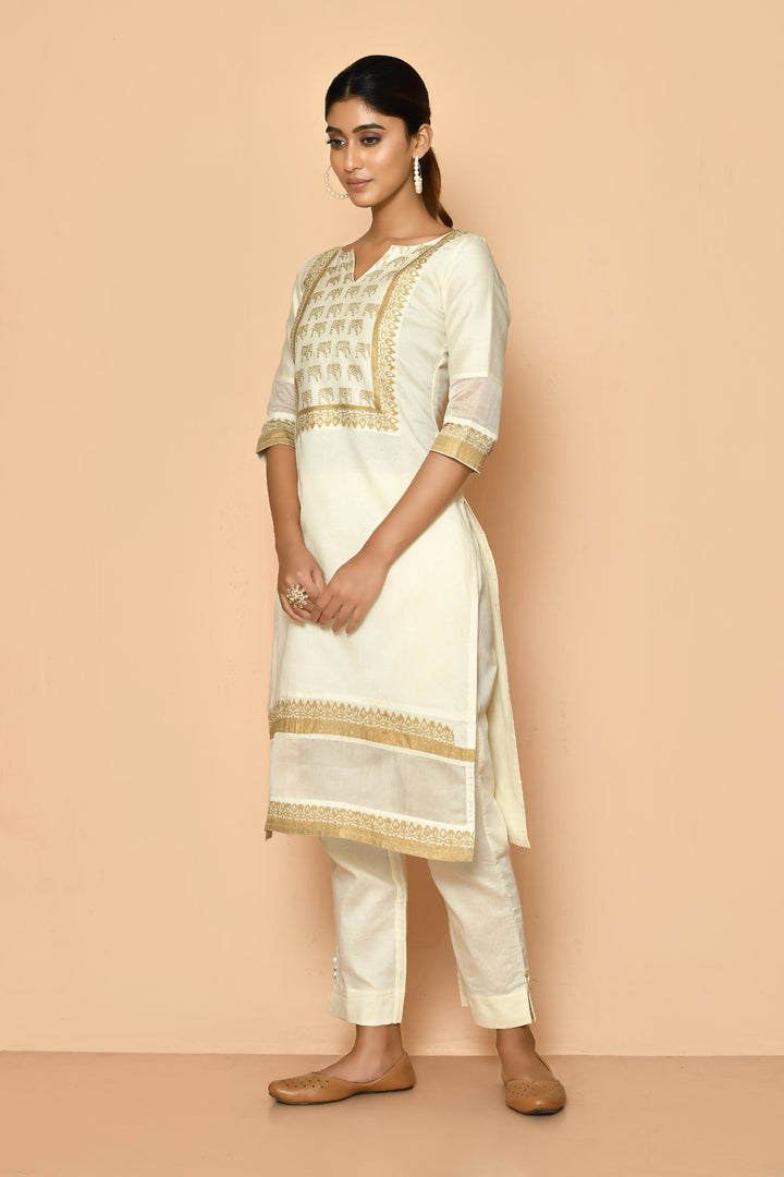 Inspired by the most beautiful gem- pearl, this kurta set is handcrafted in finest quality of Maheshwari silk features boat neck with V-cut, 3/4th sleeves and side cuts. Adorn with gold handblock prints for urban goddess. Product Note - This Kurta pant set for women is a handcrafted and eco friendly fashion product and therefore slight variations in colors and design may occur. These imperfections are distinctive and provide each creation unique look. Such imperfections are inherent to the beauty of this creations due to nature of the product. Product Specification : Sleeves: 3/4th sleeves Fabric: handloom Maheshwari silk Colour hues may slightly vary from that which appears in the image Minor irregularities is the uniqueness of handlooms and makes each piece exquisite