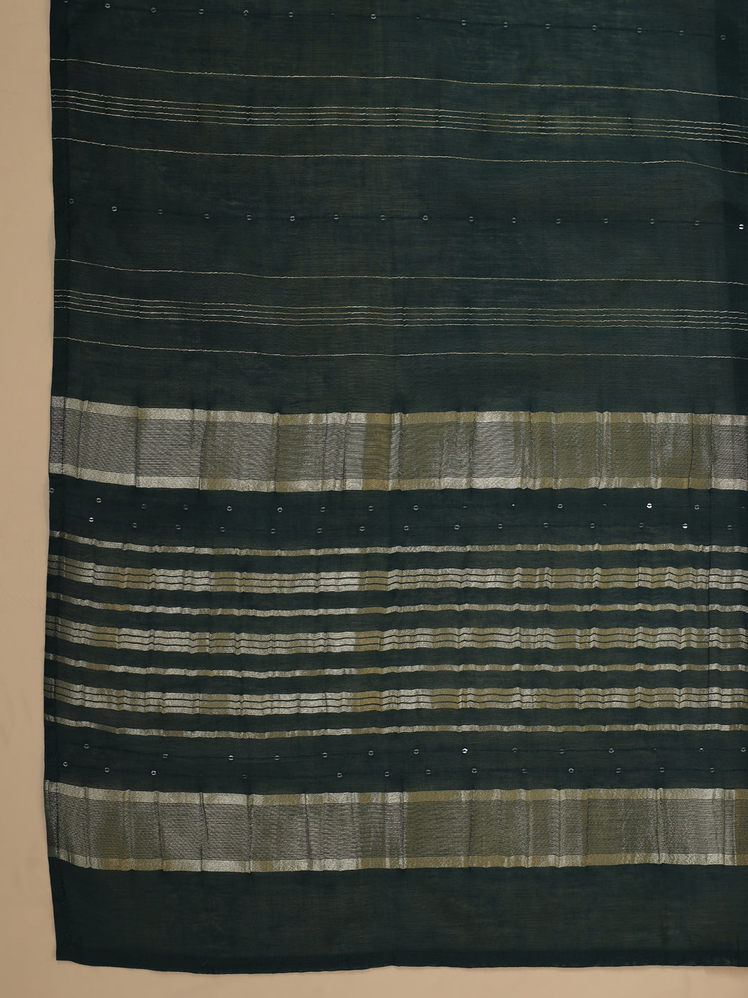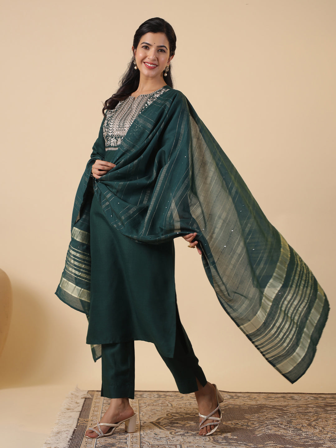 Bring festive finesse to your style with this dark green cotton blend straight kurta set highlighted by elegant yoke embroidery. The coordinated pants and dupatta complete a graceful ensemble.