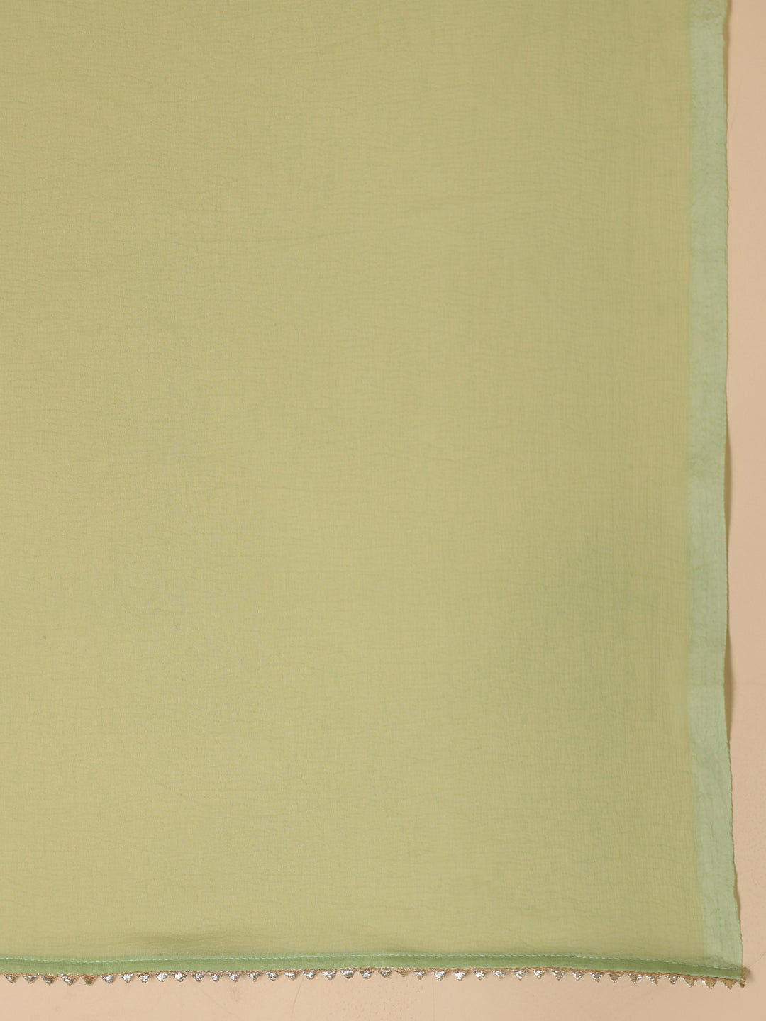 Add a refreshing touch to your wardrobe with this light green cotton blend straight kurta set highlighted by delicate yoke embroidery. The coordinated pants and dupatta enhance its graceful appeal.
