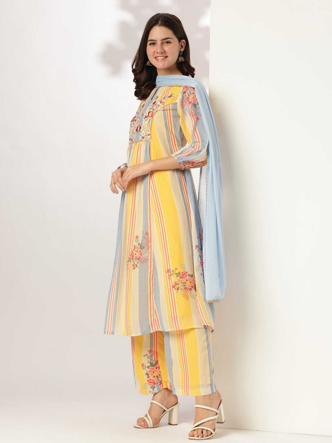Add a vibrant twist to your festive wear with this multicolor georgette A-line kurta set showcasing intricate embroidery. The flowy fabric, matching pants, and dupatta complete a lively, elegant look.