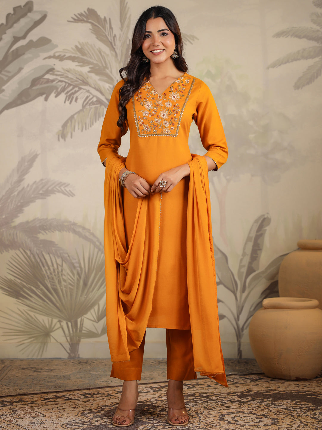 Showcase festive charm with this mustard cotton blend straight kurta set detailed with graceful yoke embroidery. The soft texture and matching dupatta make it a stylish, comfortable pick.