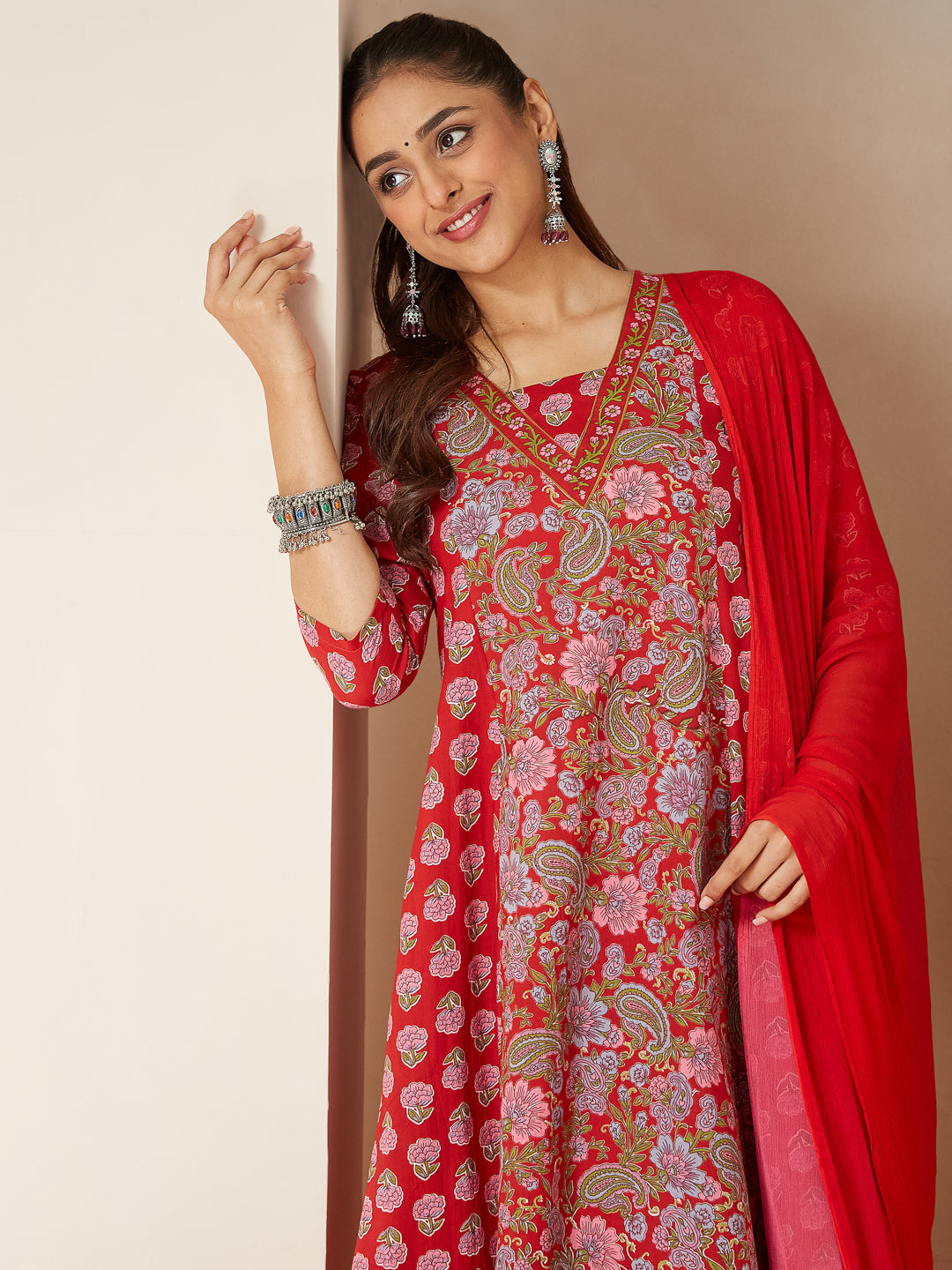 Add vibrancy to your style with this red cambric A-line kurta set showcasing elegant floral prints. The matching pants and dupatta complete this cheerful festive look.