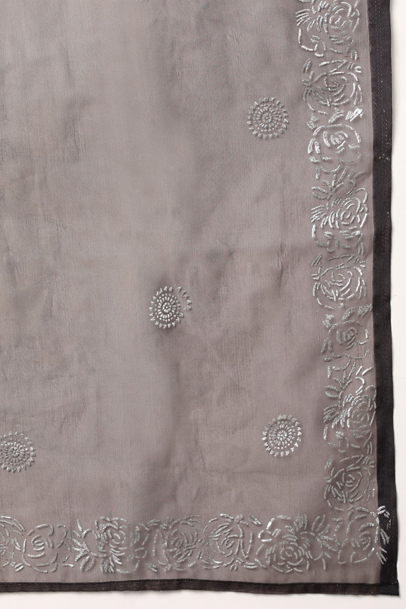 Elevate your everyday look with this black poly silk suit set featuring a beautiful floral yoke design. The straight kurta is styled with a round neckline, three-quarter sleeves, and a curved hem for a refined silhouette. Subtle gotta patti detailing adds a touch of festive charm. Paired with solid trousers and a printed dupatta, this set blends comfort with elegant style.