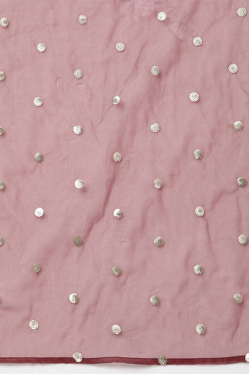 This maroon poly silk suit set features a charming floral yoke enhanced with subtle sequinned detail, giving it a refined festive sparkle. The kurta is styled in a straight silhouette with a round neck, three-quarter sleeves, and a calf-length hem for an elegant finish. It is paired with comfortable solid trousers that include a partially elasticated waistband and drawstring closure. The look is completed with a self-design dupatta finished with a clean taping border.