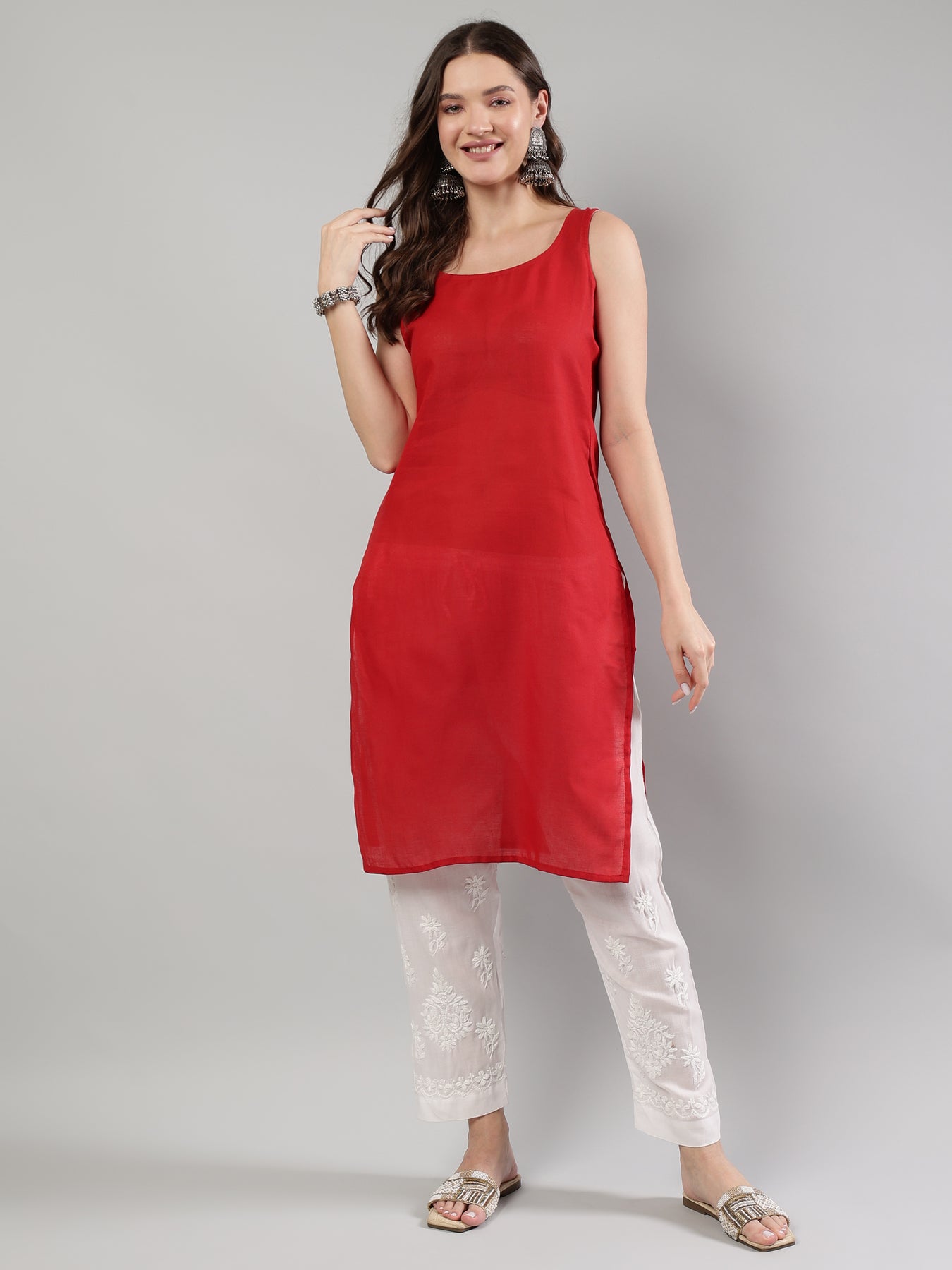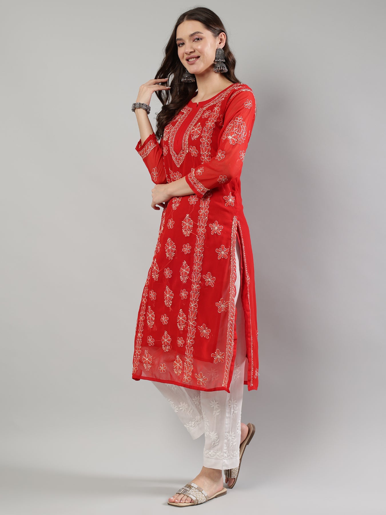An elegant red and beige chikan kurti crafted in lightweight georgette, featuring intricate beige Ghaspatti and Phanda embroidery for a sophisticated look.