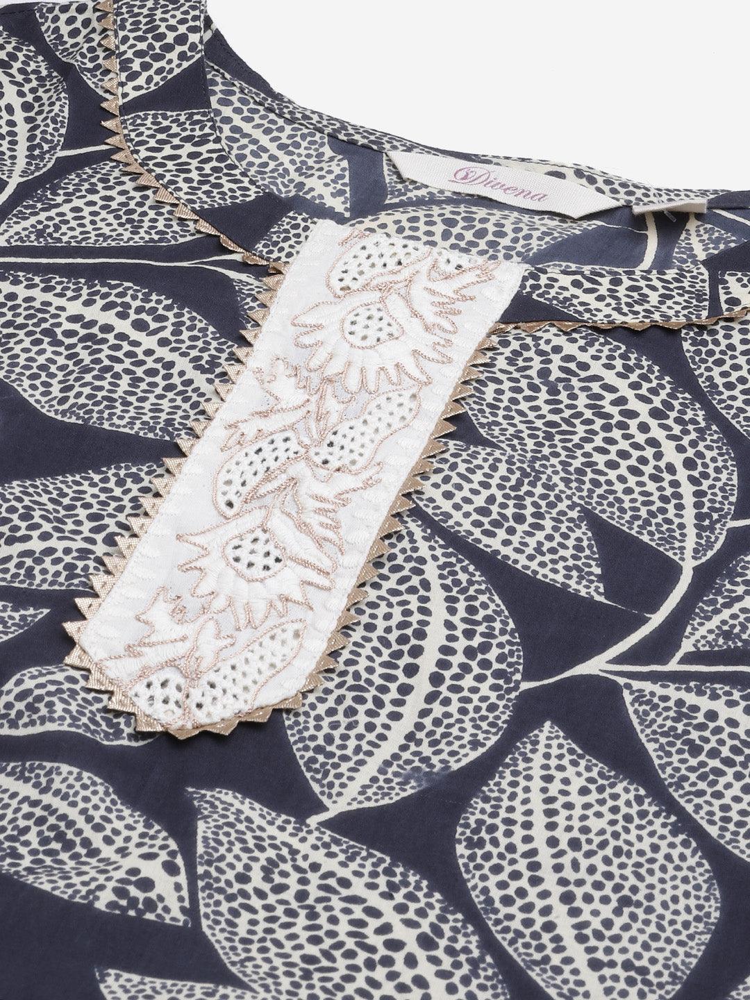 Indigo-Inspired Black Cotton Kurta With Ethnic Motifs, Paired With Embroidered Sharara And Mulmul Dupatta. Perfect For Formal And Festive Occasions. Specifications Color: Black | Neck: Round Neck | Print: Ethnic Motifs | Hemline: Straight | Sleeve: Three-Quarter Regular | Slit: Side Slits | Kurta Length: Above Knee | Top Fabric: Cotton | Bottom Fabric: Cotton | Bottom Type: Sharara | Dupatta: Mulmul