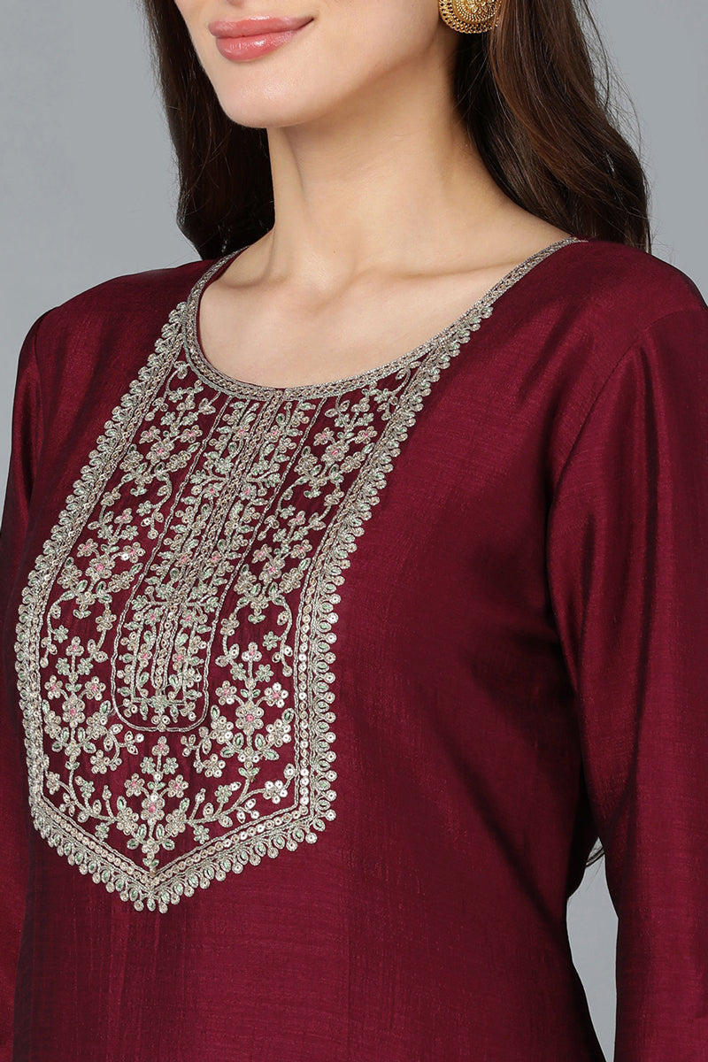 Add a touch of elegance to your wardrobe with this maroon silk-blend kurti sharara set. The kurti features a beautifully crafted yoke design, round neckline, and three-quarter sleeves, offering a rich festive appeal. Paired with a stylish sharara and a complementing dupatta, this outfit brings together traditional charm and modern finesse for any celebration.