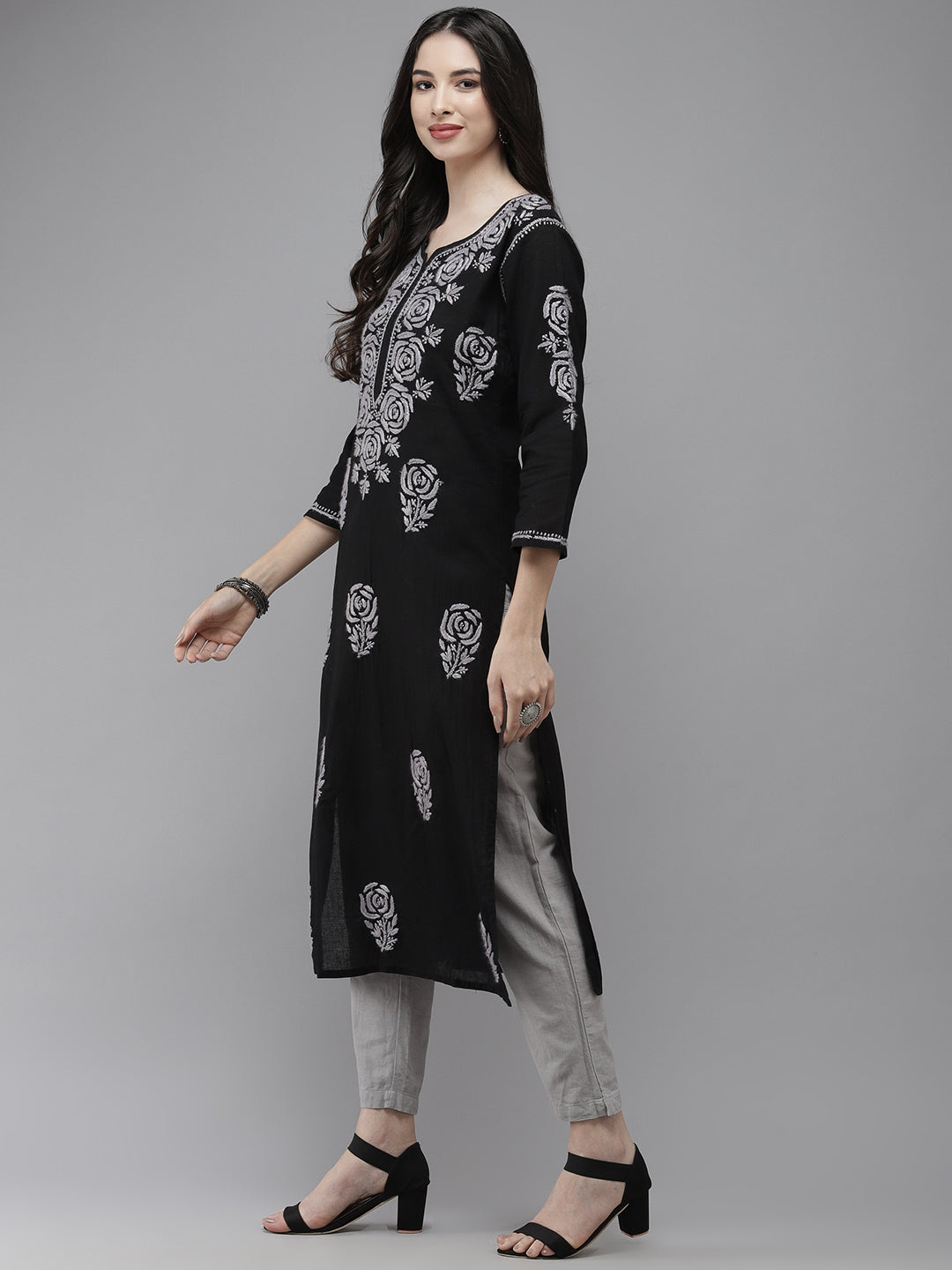 This is a Black colored Cotton Straight Kurta. The product freatures are it is a Ethnic Motifs printed, Three-Quarter sleeves, Calf length, Round Neck, Grey colored Embroidered and Straight hemline. Ocassion: Daily Print or Pattern Type: Ethnic Motifs Printed Slit Detail: Side Slits Weave Pattern: Regular Weave Type: Machine Weave Sleeve Length: Three-Quarter-Sleeves Neckline: Round Neck Sleeve Styling: Regular Sleeves Ornamentation: Chikankari Shape: Straight Length: Calf Length Hemline: Straight Design Styling: Regular Kurta Length: 45 Inches