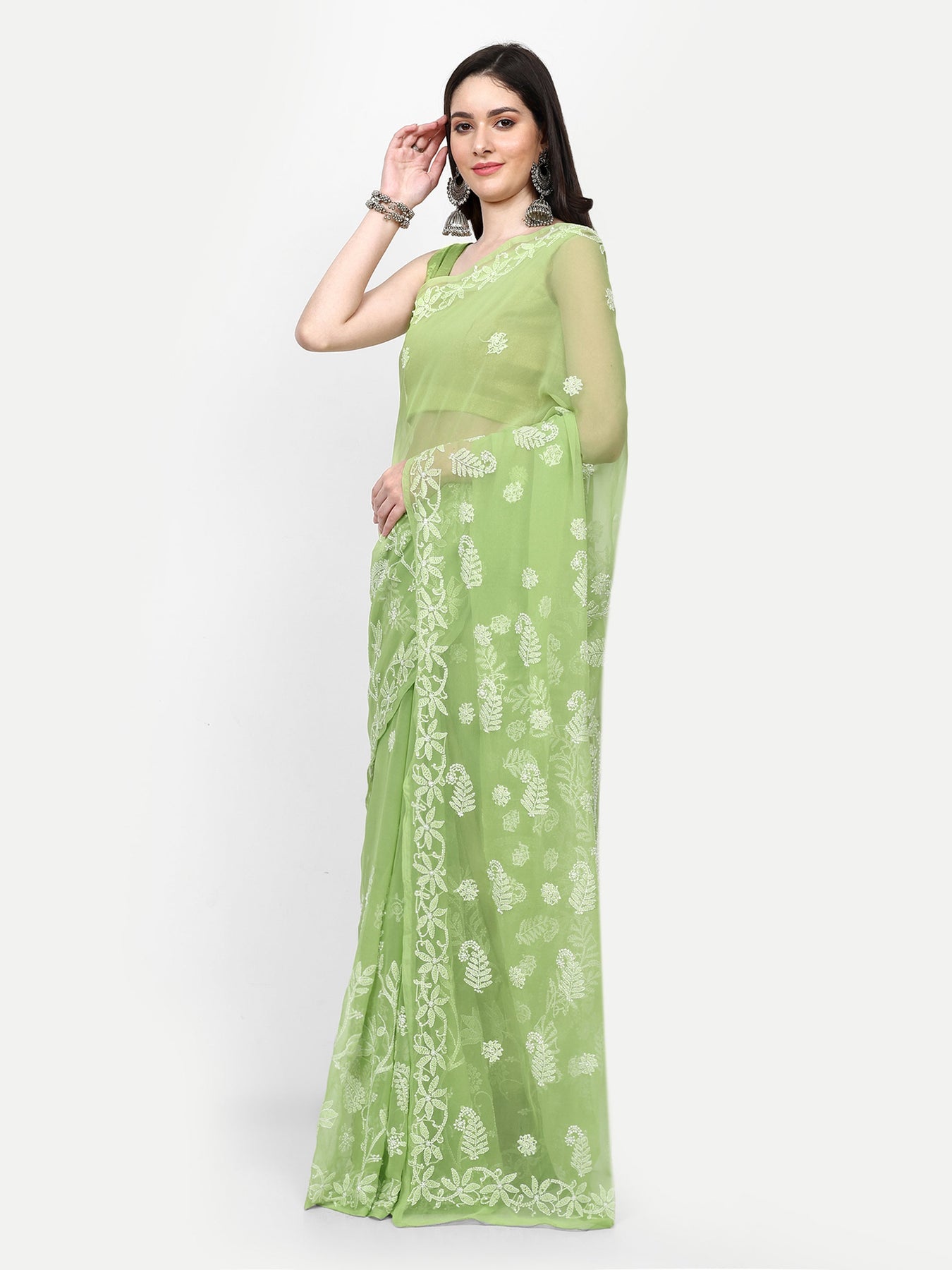 This Green Georgette Chikan Saree Offers A Comfortable And Relaxed Silhouette To The Wearer, The Fabric And Embroidery Is Skin Friendly.